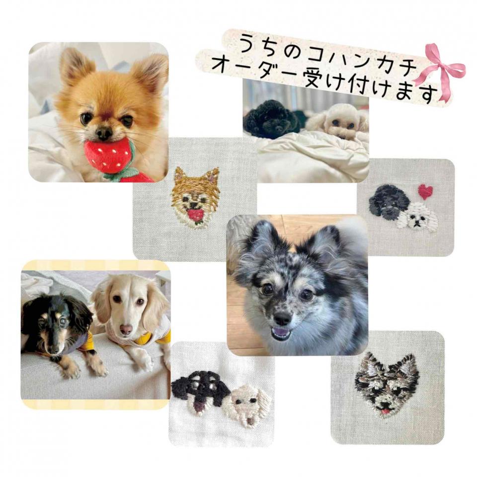 「*うちのコ ガーゼハンカチ*世界にひとつだけ。あなたのわんこがハンカチになります!ハンカチはミニカバンにも入る小ぶりなサイズ♪手刺しゅうで、ひと針ずつ丁寧に仕上げていきます。」