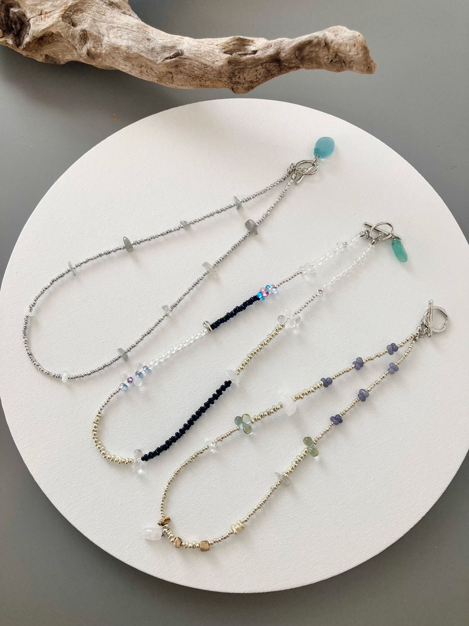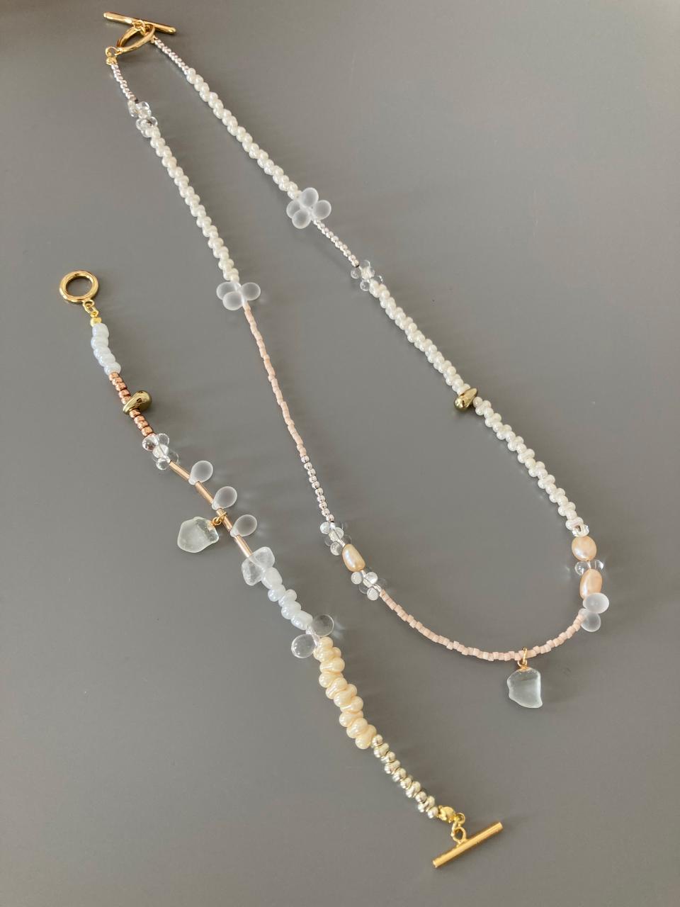 「MEME」さんの新作アクセサリーです。「小さなシーグラスのチャームを付けたネックレスとブレスレットの新作を作りました。」