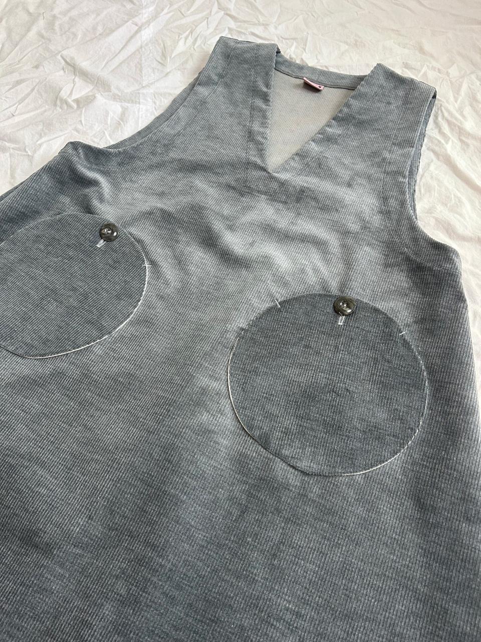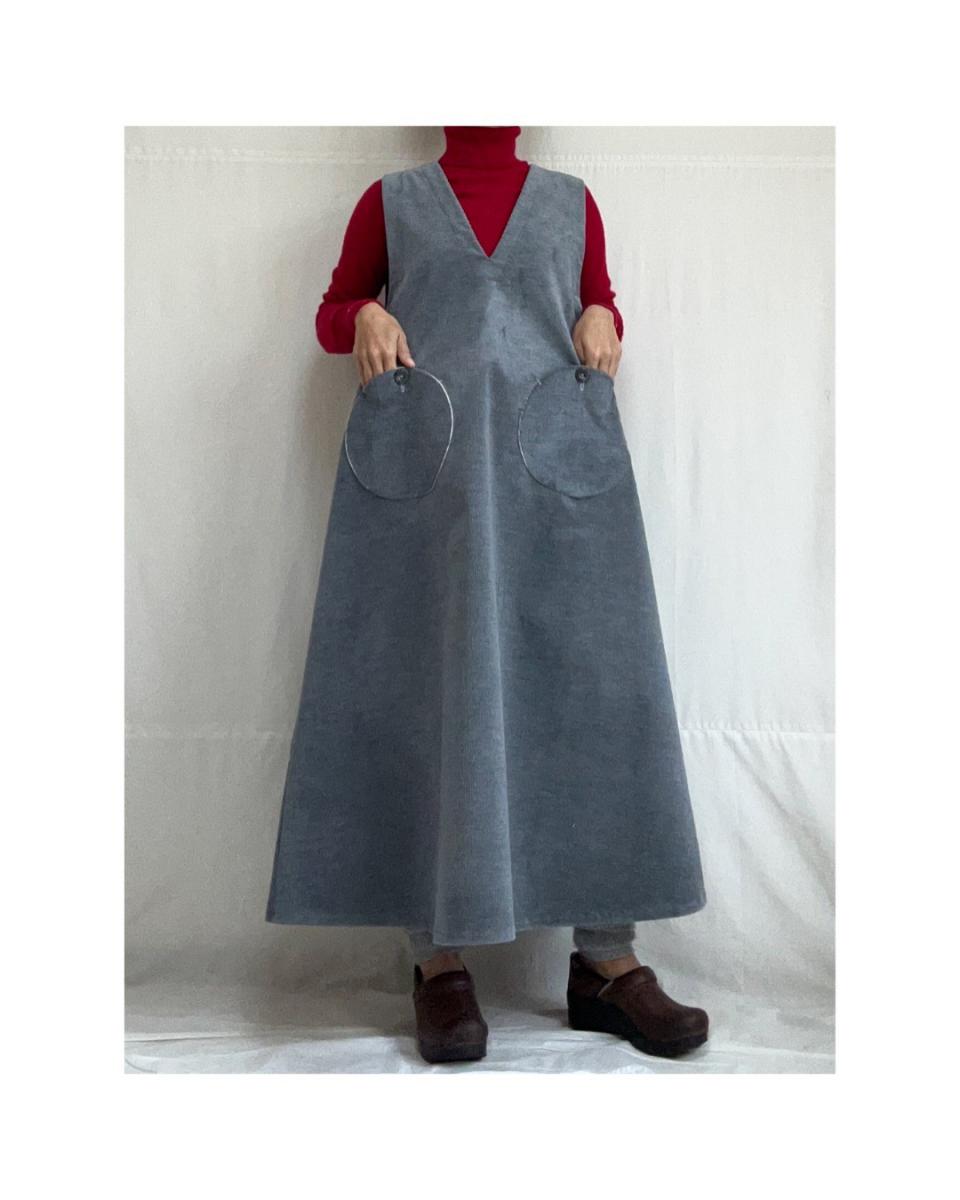 「⚫コーデュロイの丸ポケットワンピース。袖ぐりの開きもゆったりで着やすいデザインにしました。これからの季節に活躍してくれるワンピースです。」