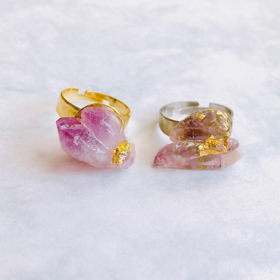 「②ナチュラルビューティーリング。アメシストを使用した 個性的でナチュラルなラフロックのデザイン。シンプルながらも存在感を。アメシストは「愛の守護石」心に平穏を与えストレスを軽減するサポートを。」