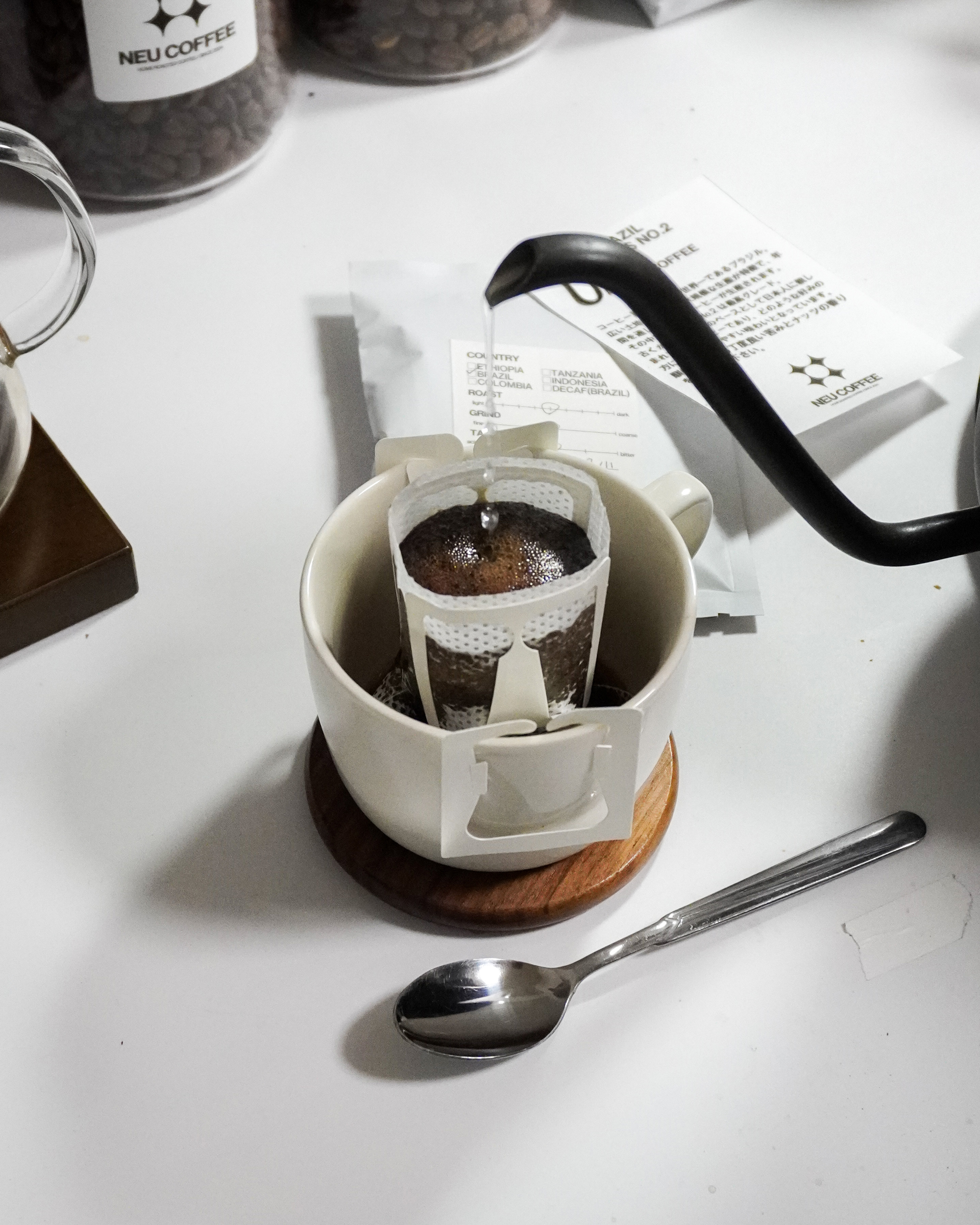 おやつのおともには至福の一杯を。ふわもちのパンとも相性良し。「NEU COFFEE」さんの新商品ドリップパック。