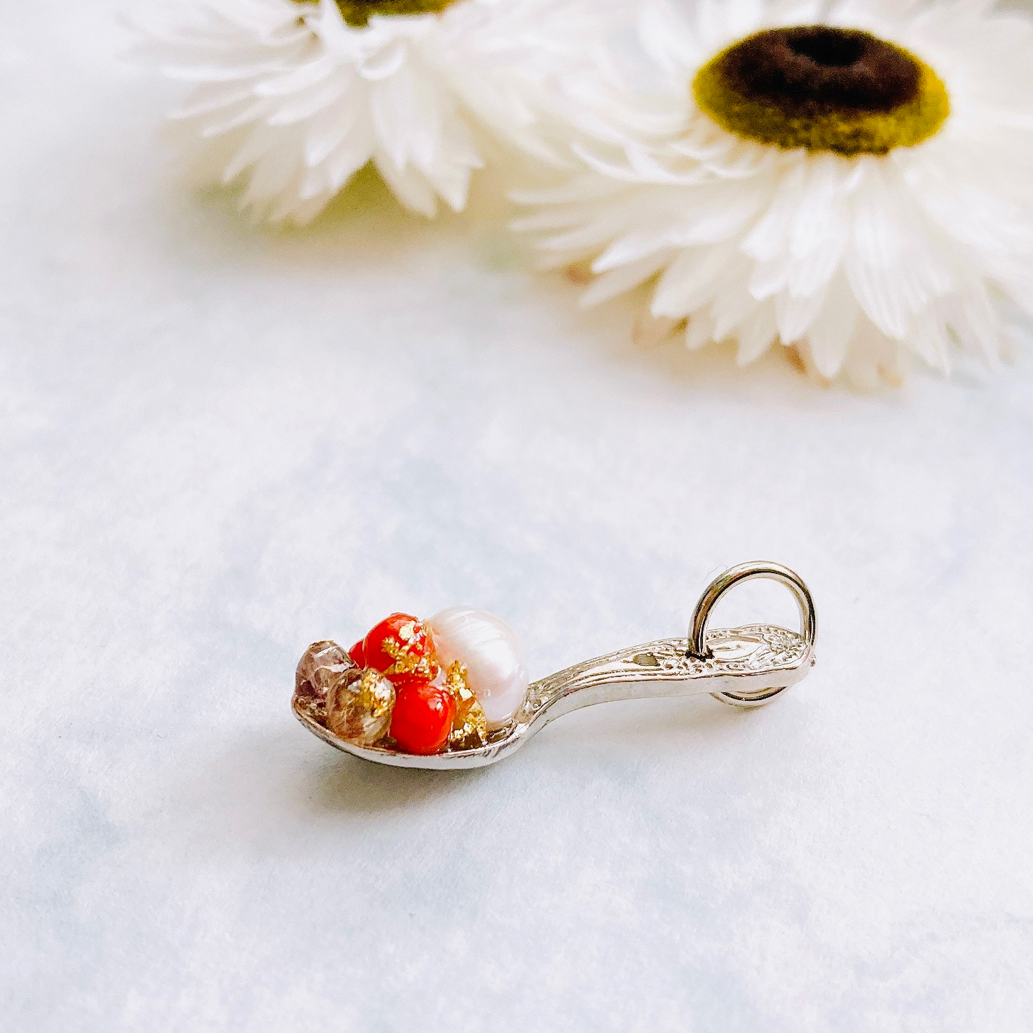 「③誰もが心ときめく、生クリーム苺ケーキを一口。繊細な装飾のミニスプーンに イタリアサルデーニャ島沖でうまれた本珊瑚。天然の鮮やかな赤色と 淡水パールのなめらかな白色を盛り付けた 幸せをすくう天然石スプーンチャーム。ナチュラルな世界観を体感いただけたら嬉しいです。