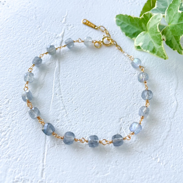 「【ラブラドライトのブレスレット】グレージュの石にブルー〜虹色の光が現れます。色んな洋服にも合わせやすいのも良き˚✧⁎⁺˳✧༚です。」