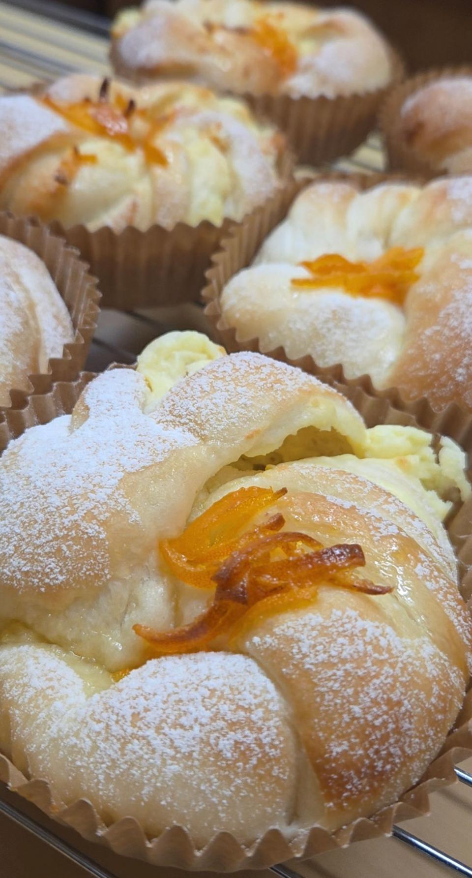 「Satoぱん工房」さんの今月のおすすめは…?「季節限定オススメパン🍊『シークワーサー&クリームチーズパン』庭先のシークワーサーを完熟させ、ジャムを作ってクリームチーズと混ぜ合わせふわもち白ぱんに練り込み焼き上げます🍊」