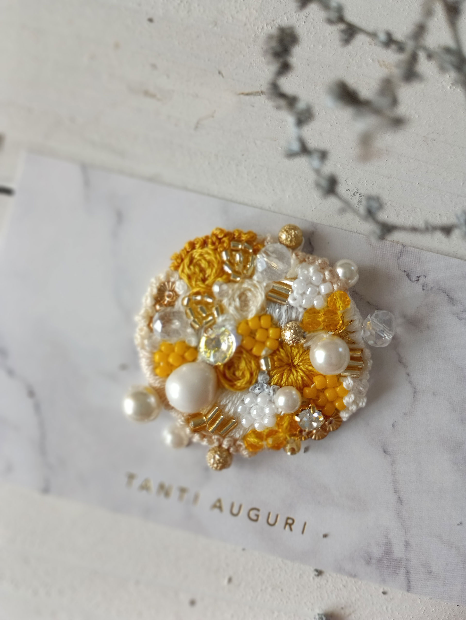 「蝋梅(ろうばい)ブローチ:寒い冬に咲く、蝋細工のような美しい黄色の花、その花弁と雪や朝露の煌めきを刺繍で表情しブローチにしました」
