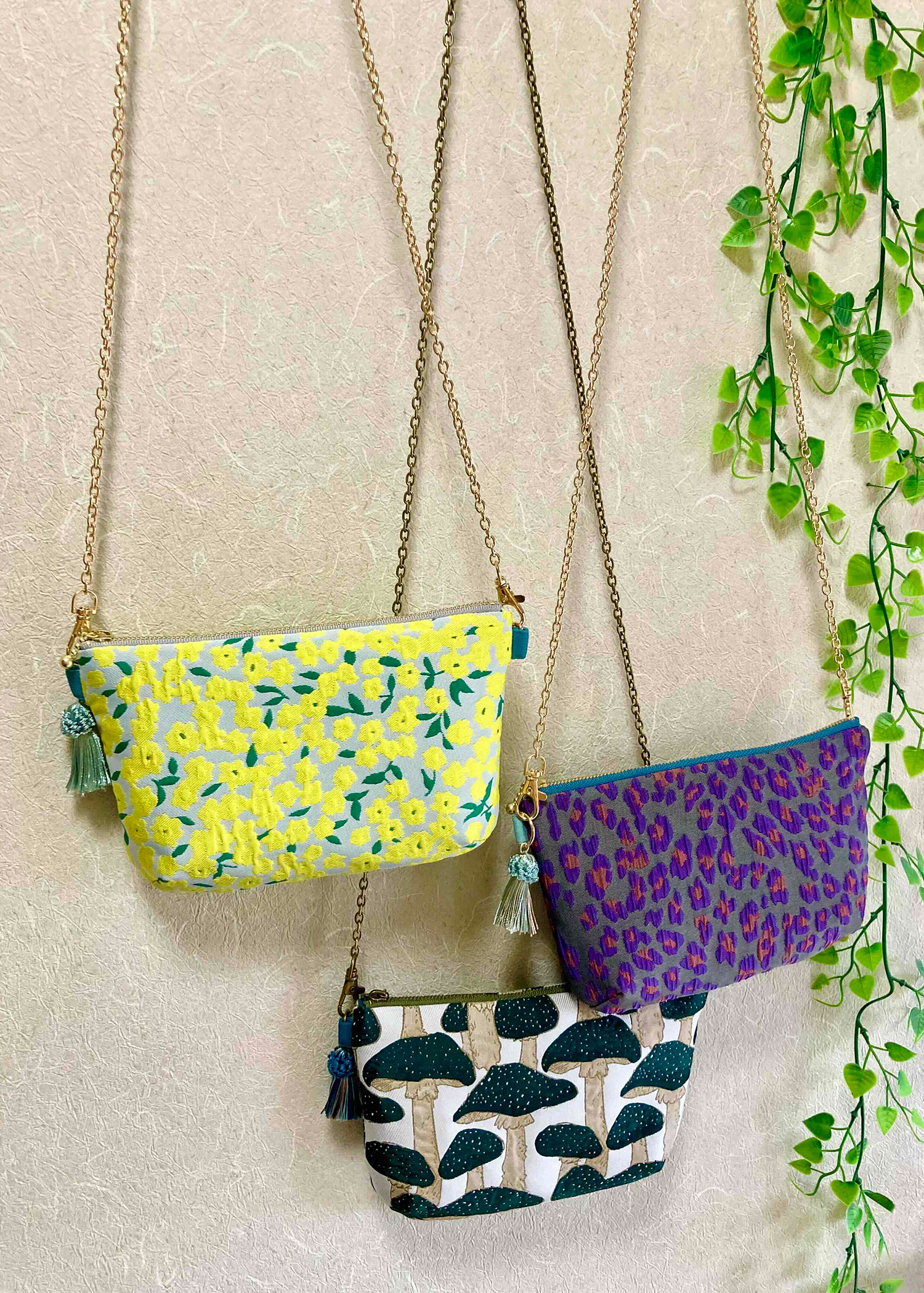 リバティをメインに心惹かれる布地を使って布小物を作られている「ichi to san」さんのオススメはこちら。「今回のオススメは、どちらもジャガード織の生地を使った、チェーンショルダーポシェットと丸底バケツバッグです。ジャガード織は、存在感がありありの魅力的な生地です。ぜひ、見に来てくださいね!」