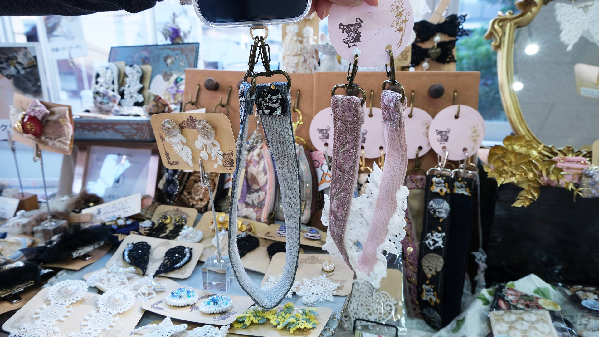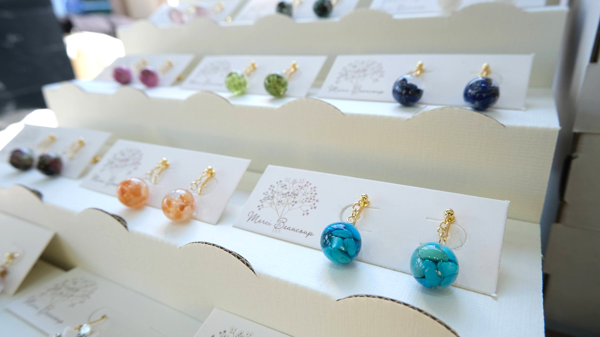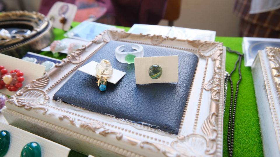初出展の「おはくのおへや」さん。地球のカケラ(ストーンやシーグラス)を使ったカケラジュエリーたち。まあるいシーグラスは100年ほどかけて海の中で作られるそうです。浪漫~。
