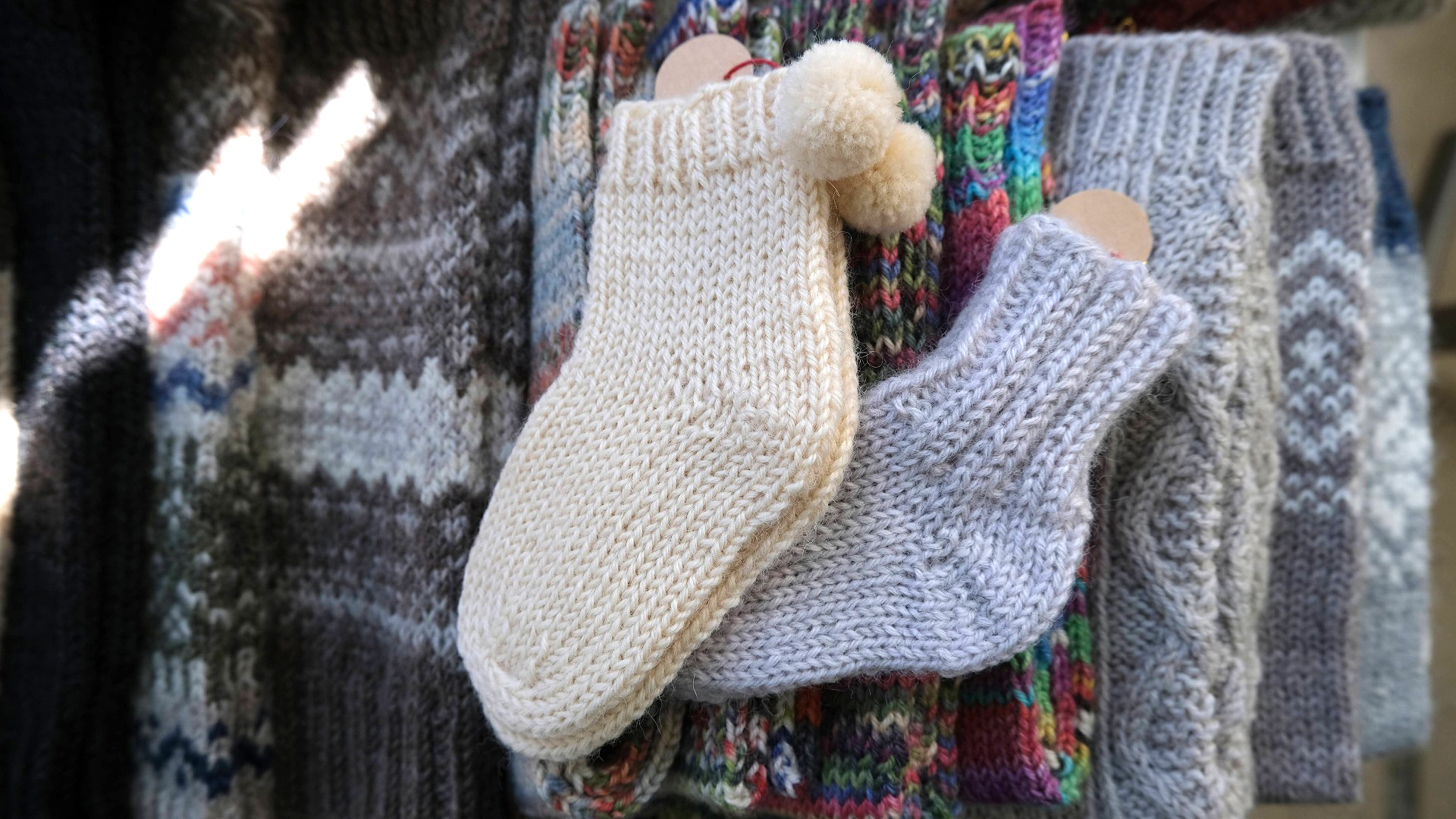 お二人で出展「Kei’s farm」さんの手編みの小物いろいろ。手編みの靴下はふわふわあったかそう。