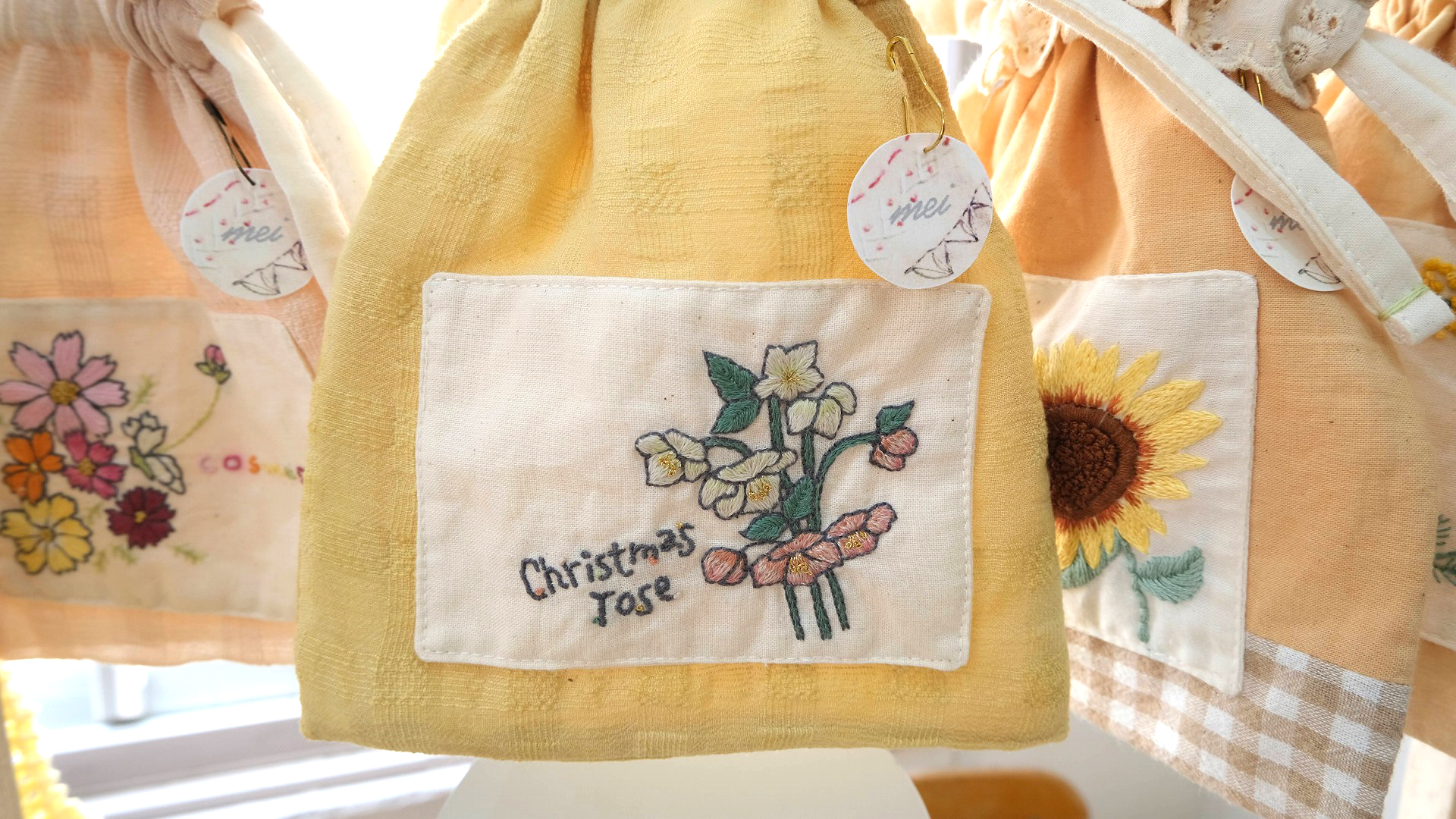 「mei」さんの新作はクリスマスローズのポーチ。ご自身で染めた布も、いい色合いです。
