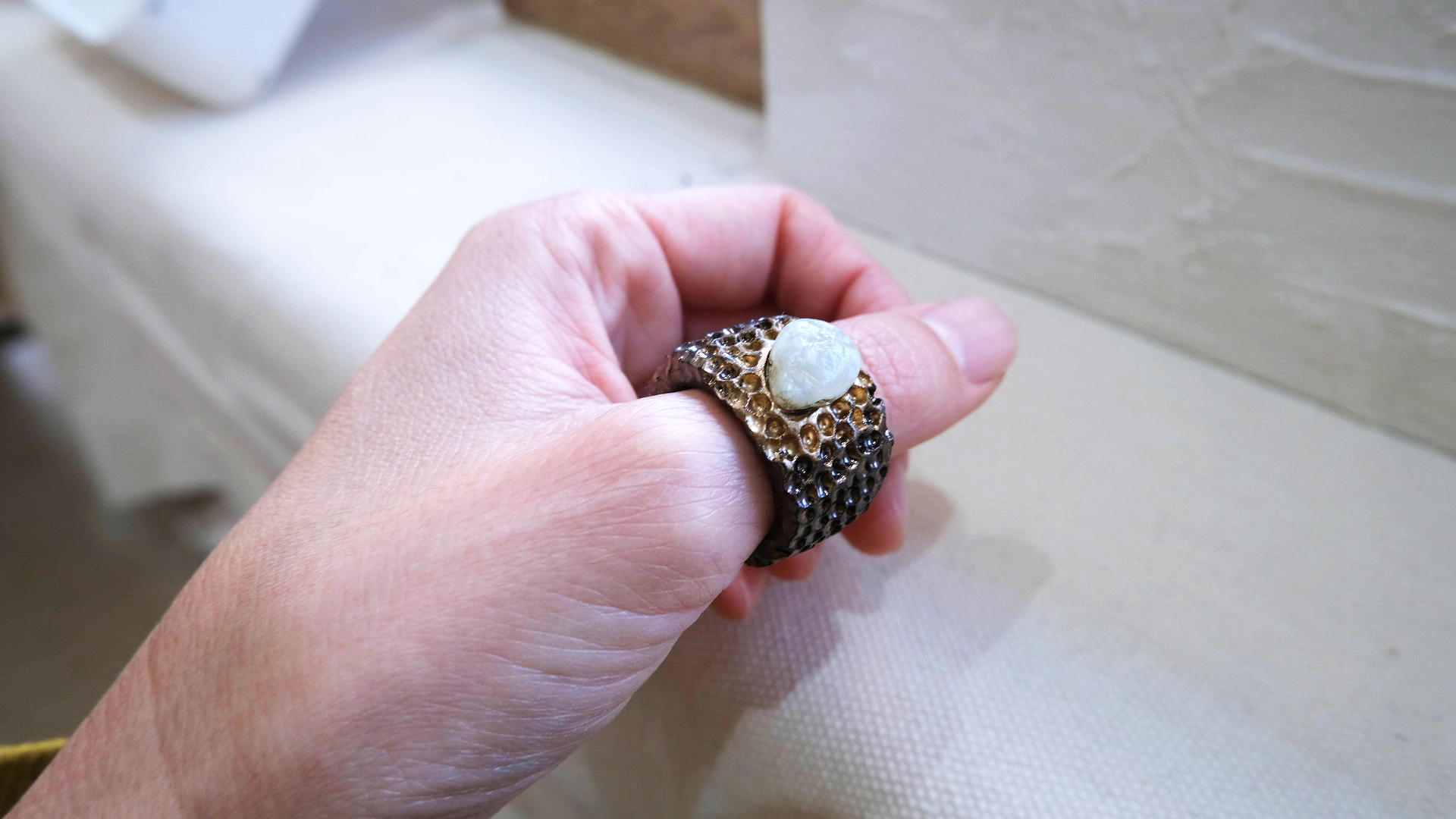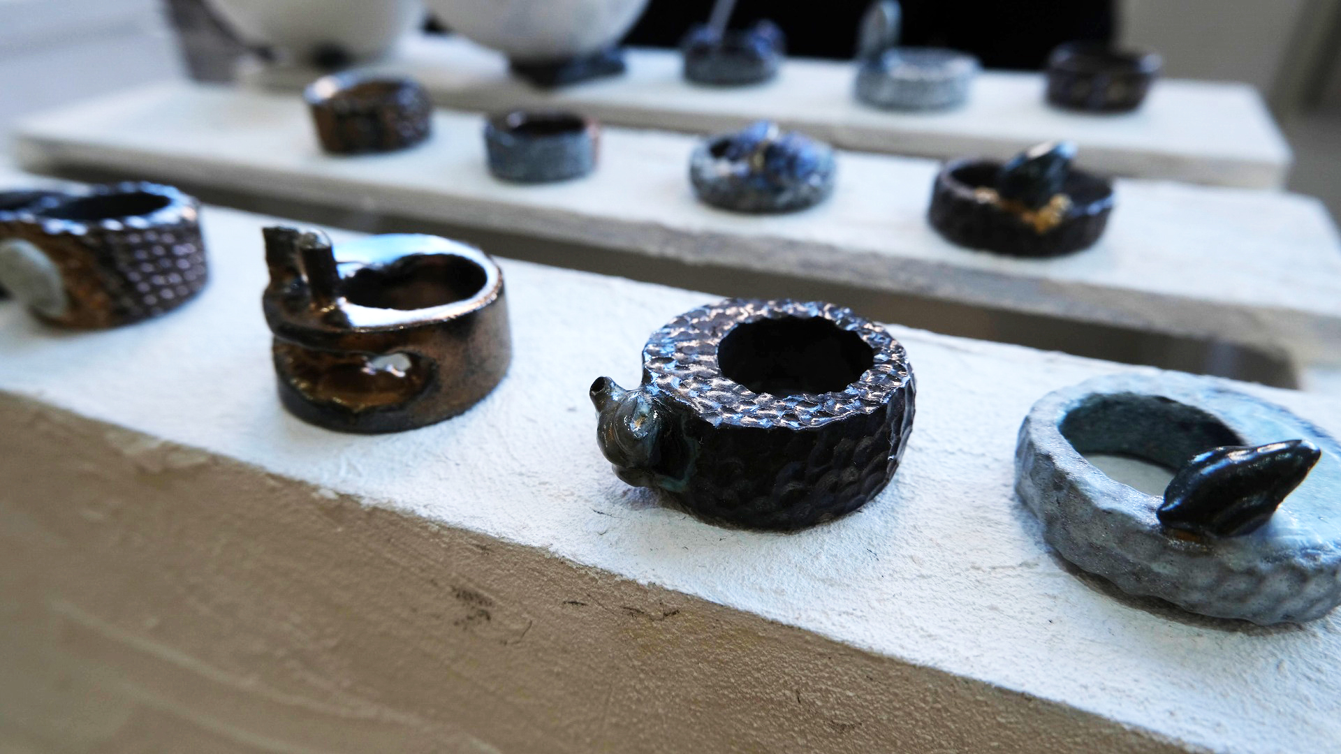 初出展の「瑠璃茶屋」さん。生き物をモチーフにした焼き物がいろいろ。指輪がカッコよかったですよ。