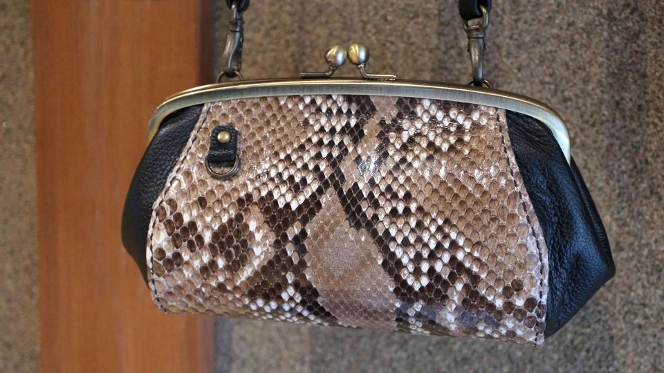 革もいろいろありまして。「Ons' Leather Craft」さんのこちらのがま口バッグはへび革。