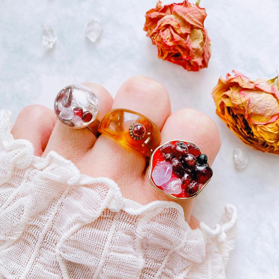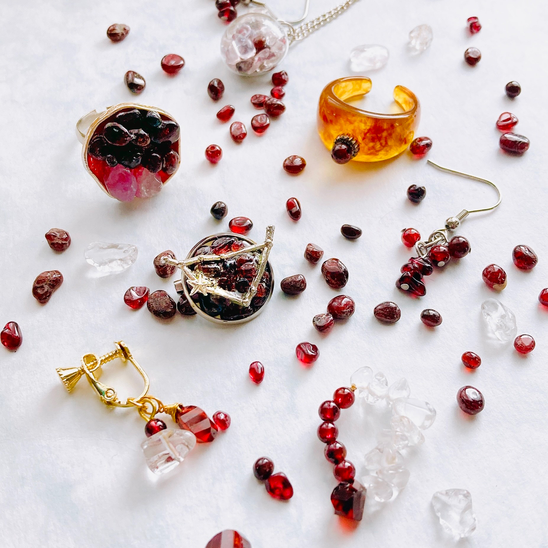 「ガーネット&やぎ座さん星座ブローチ。ガーネット&クリスタル片耳イヤリング。ベッコウ飴風の一粒ガーネットリング。1月のバースデーギフトにも。」