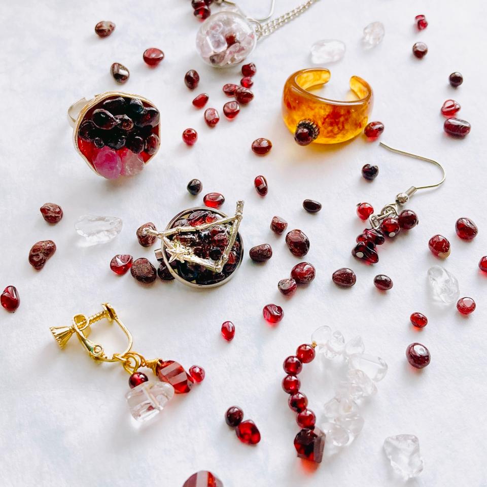 季節をまとう「おはくのおへや」さん。1月の誕生石のガーネットやシーグラスを使った美しいアクセサリーが並びます。
