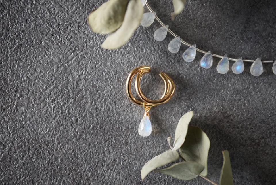 「イシトユメ」さんからも新作アクセサリーが届きました。「霞がかかったような質感の石に水色の光が映る、ブルームーンストーンの一粒イヤーカフです」