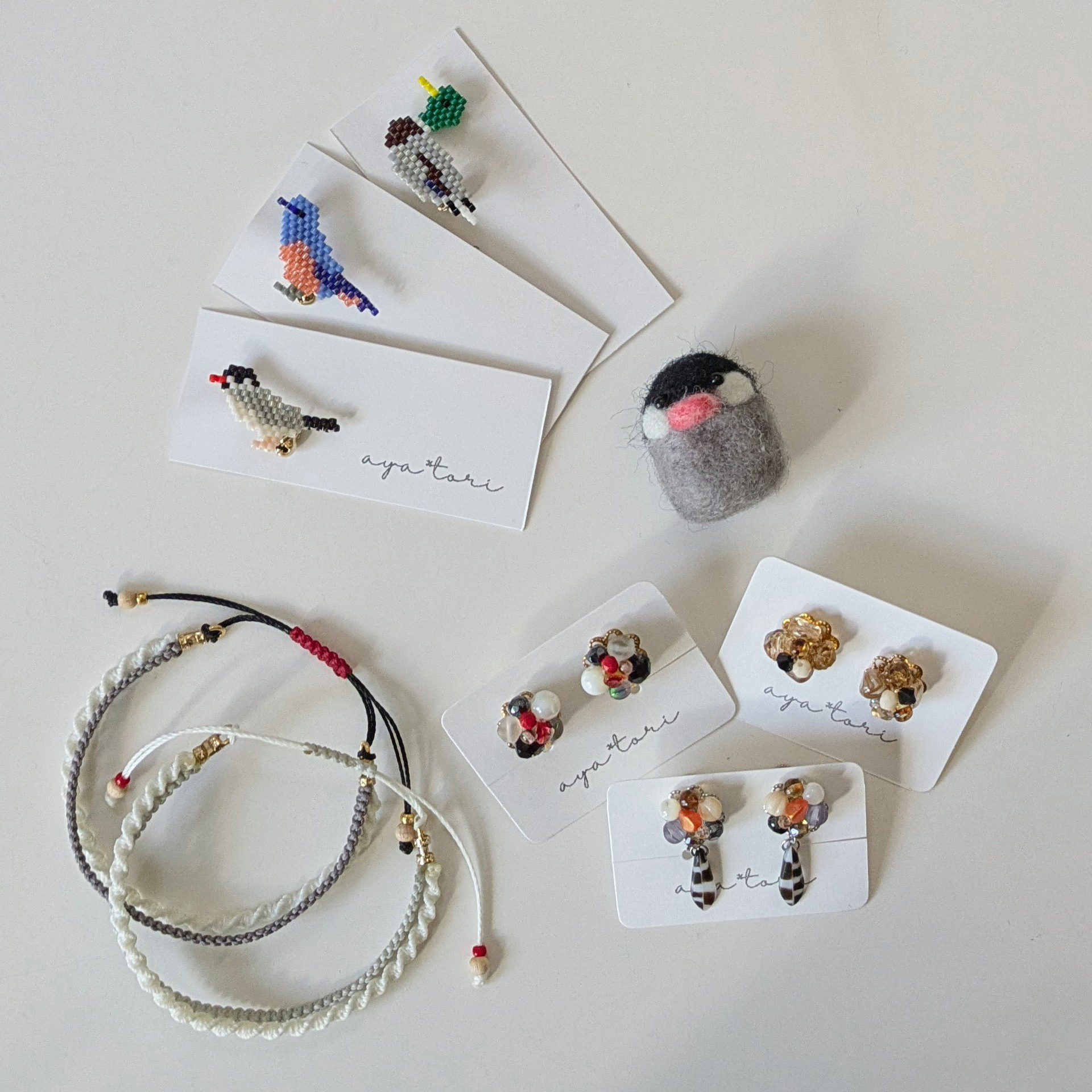 屋号を変えて心機一転、お久しぶりの出展です「aya*tori」さん。ビーズアクセサリーと小さな小鳥グッズを出展されます。