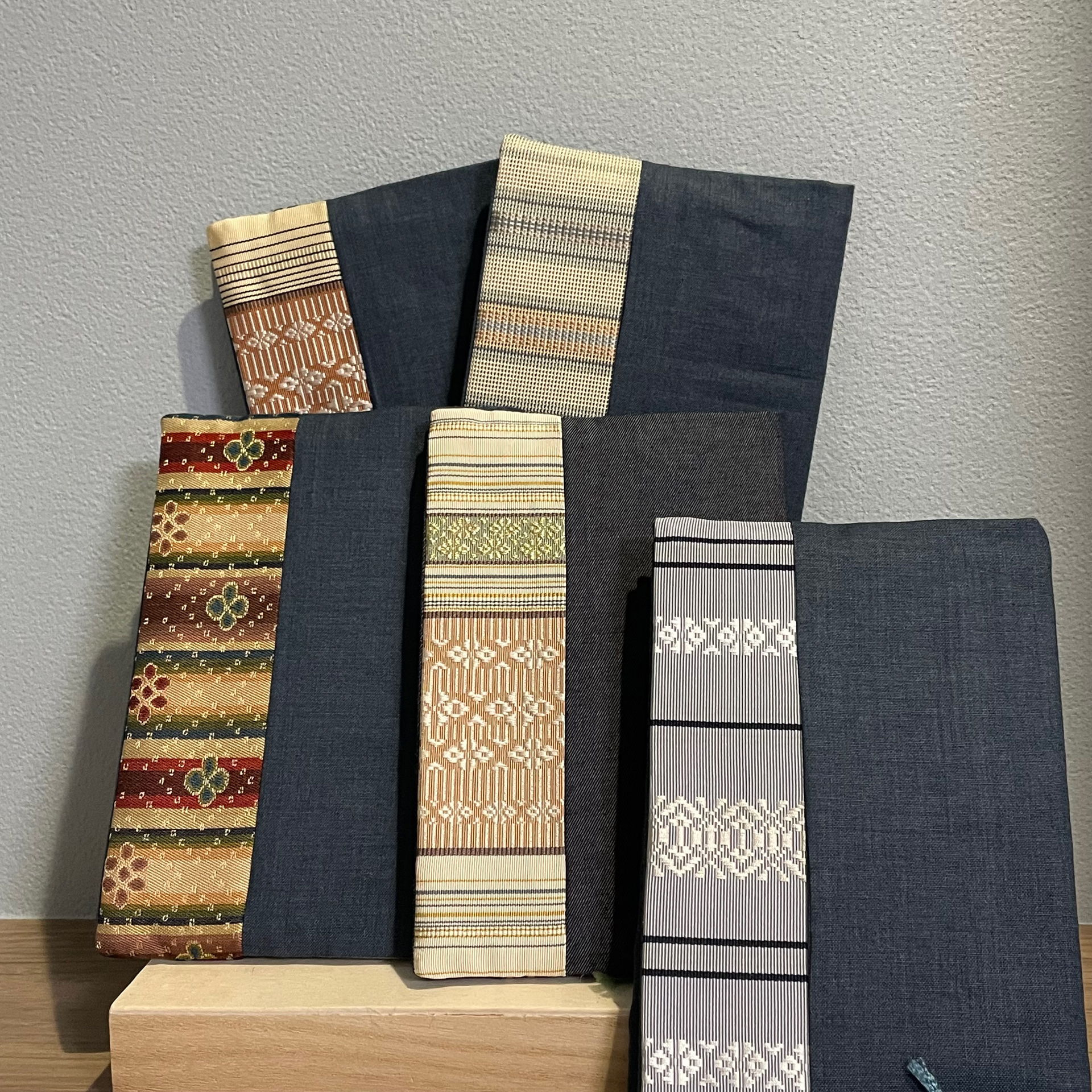 「今月の新作は、博多織や西陣織をあしらったブックカバーです。意匠登録出願中の工夫で1000ページ越えの極厚本から数ミリの薄い本まで、一枚の同じブックカバーで対応できちゃう優れものです。」