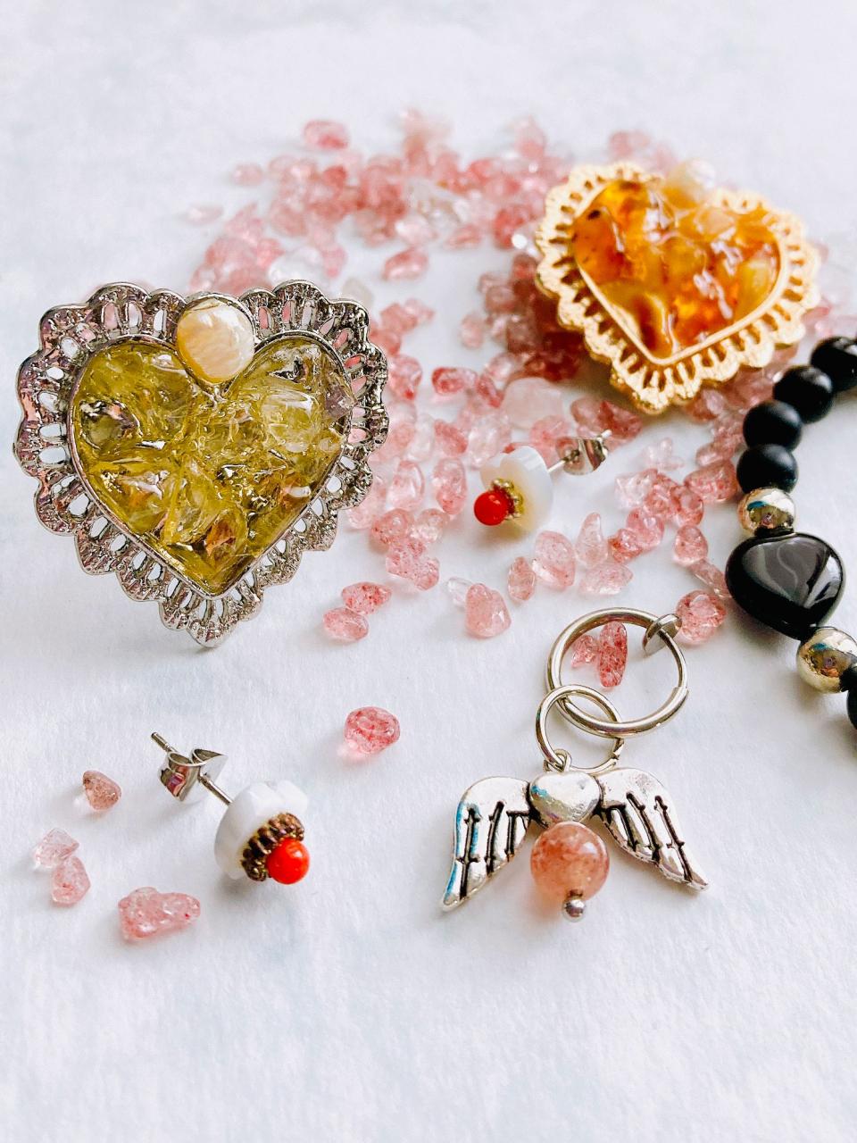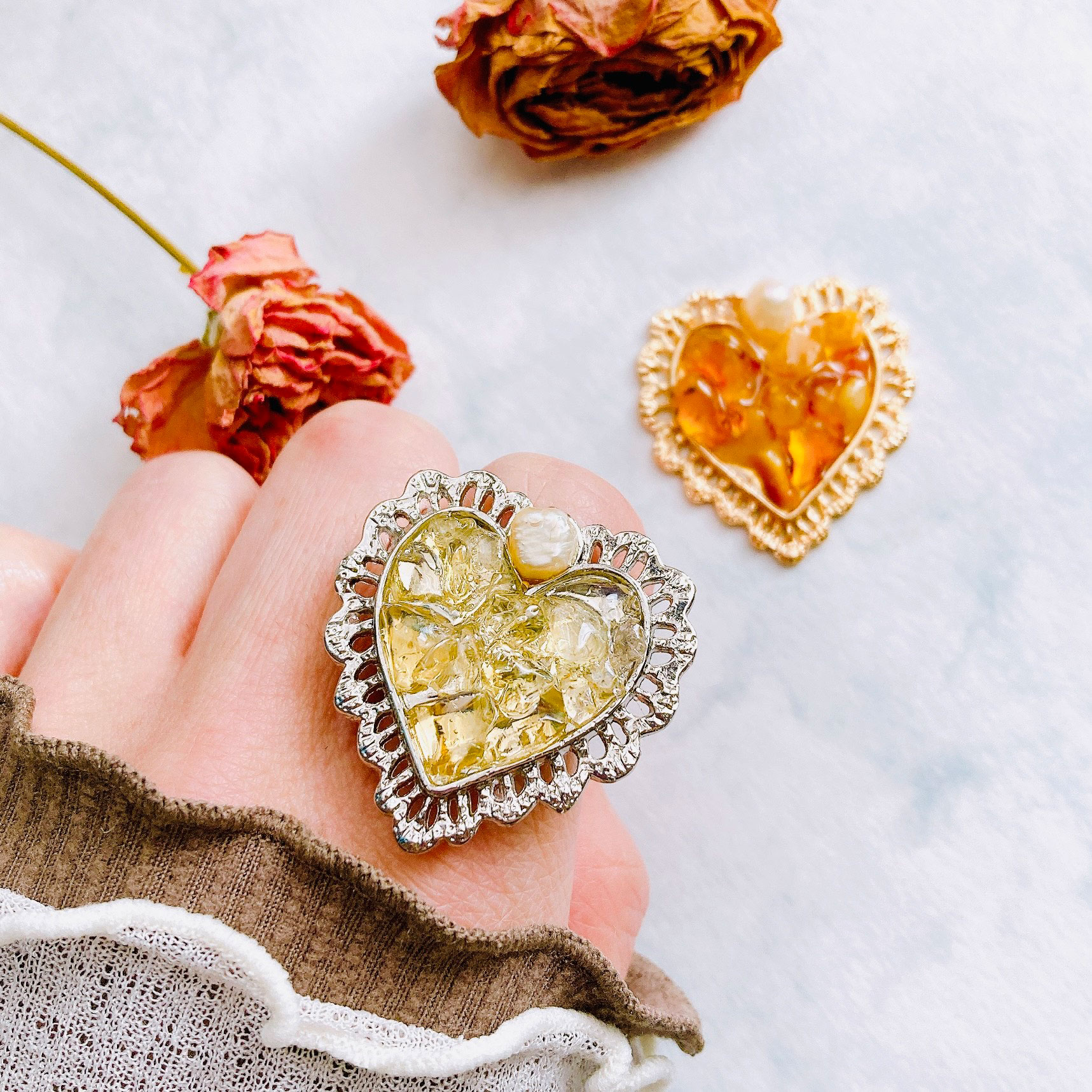 「以前ご好評をいただき完売していたビッグハートリングが温かみのある琥珀(アンバー)と、希望の光のようなシトリンを携えて再登場!指先でキラキラと輝く大粒のハートは見るたびに心を浮き立たせてくれます。」