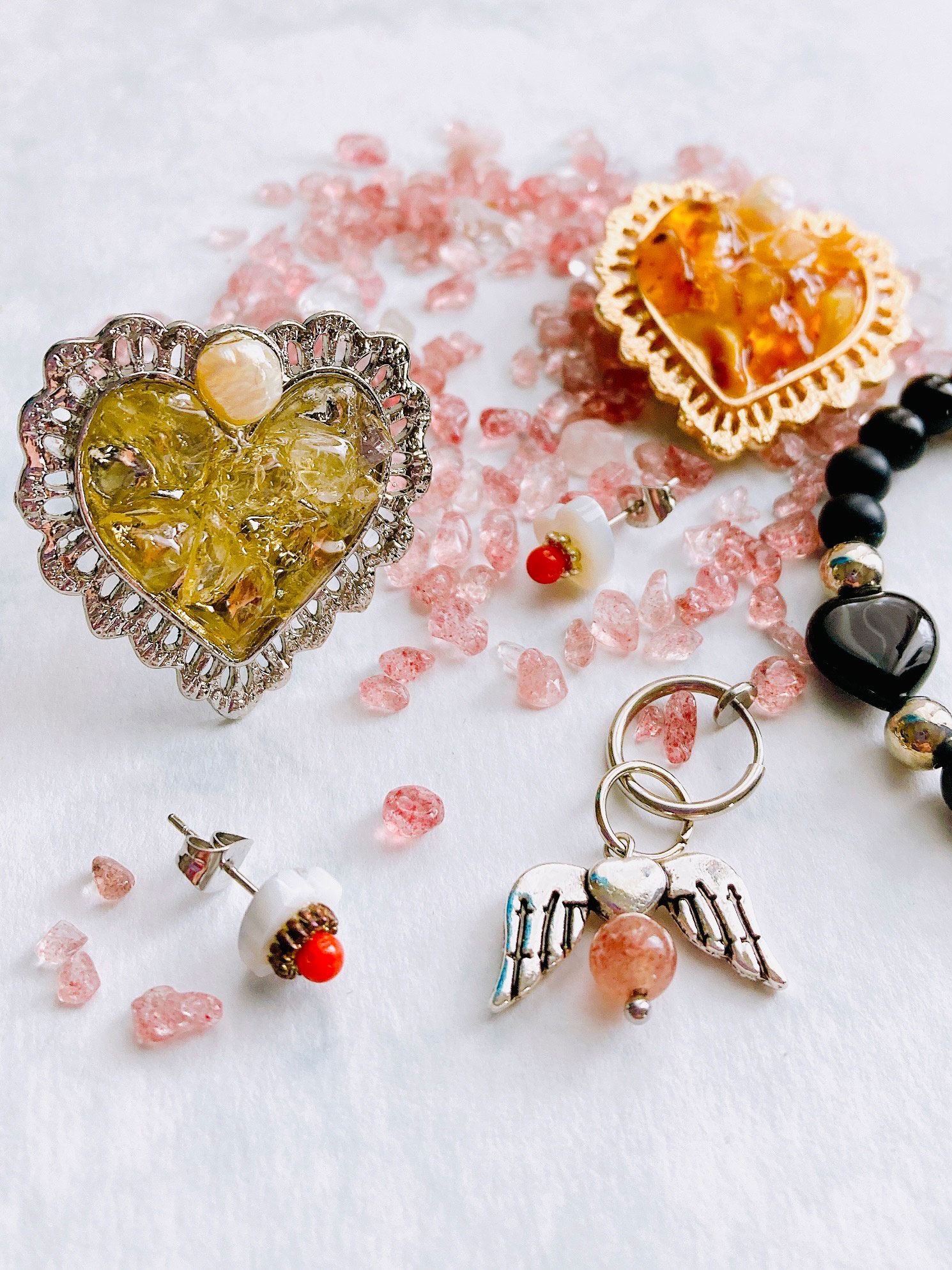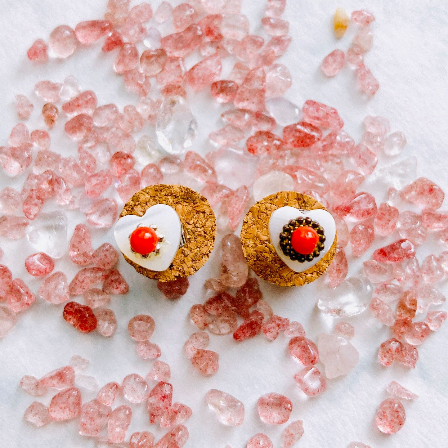 「パールのお母さん、マザーオブパールに情熱的なイタリア産赤サンゴを添えた片耳ピアス。甘さを引き締めるブラックオニキスのブレスレットも登場。「可愛い」だけじゃない。大人の遊び心を詰め込んた天然石ジュエリーたちにぜひ会いに来てください♡」