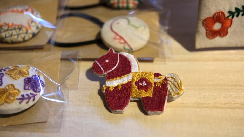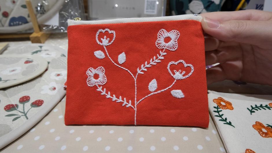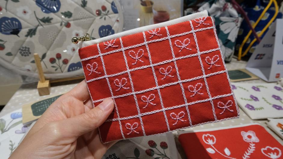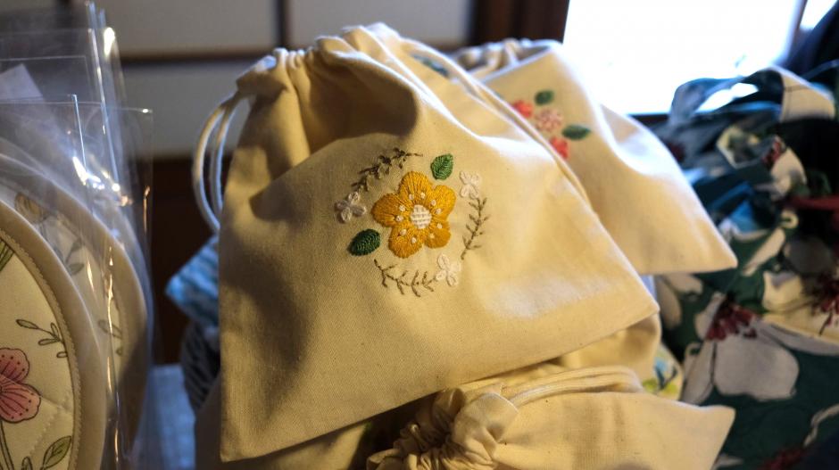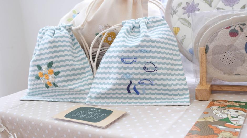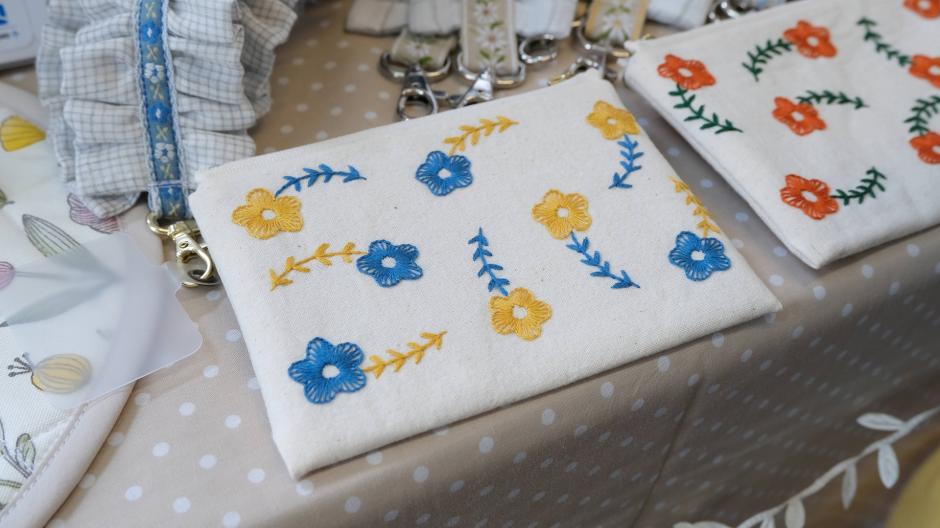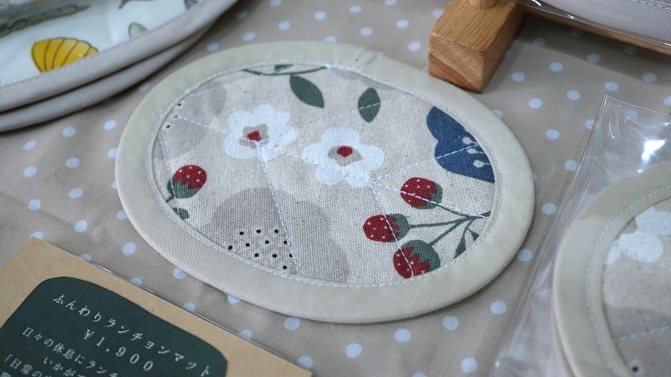 丁寧にひと針ひと針作られていると感じ取れる「あいごの布小物」さんの作品たち。バッグやポーチ、ランチョンマットなど生活を豊かにしてくれそうなアイテムが並びます。