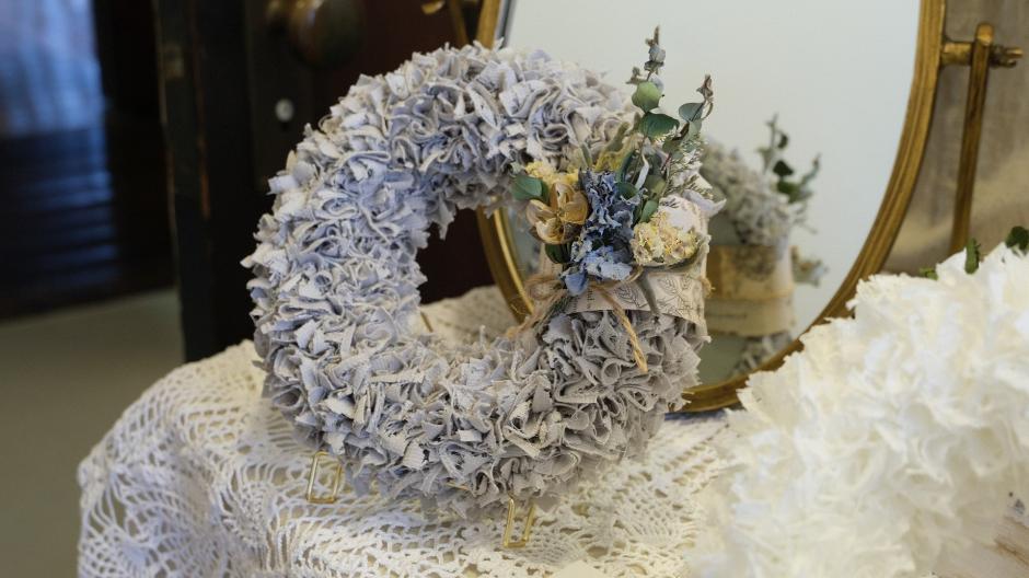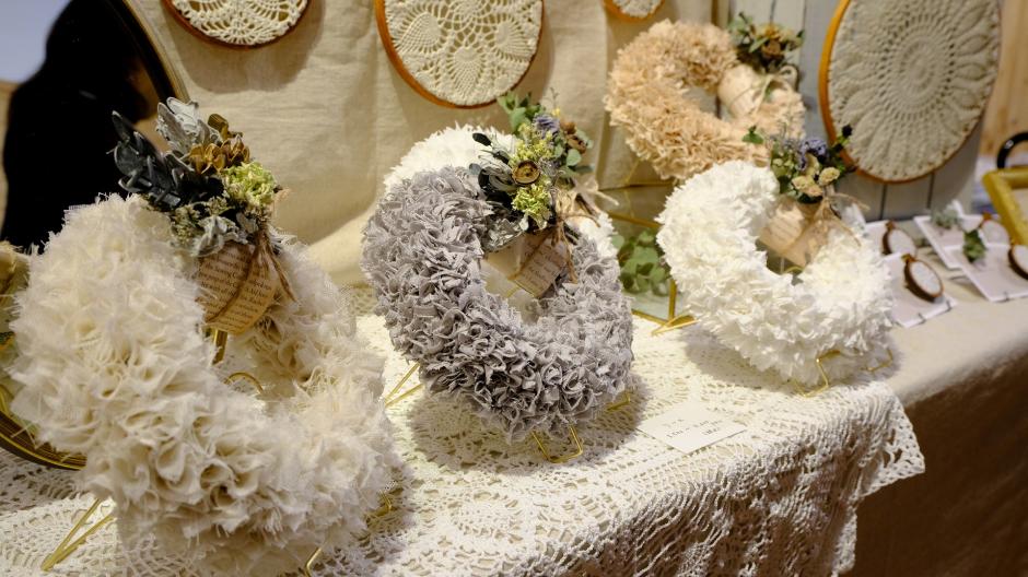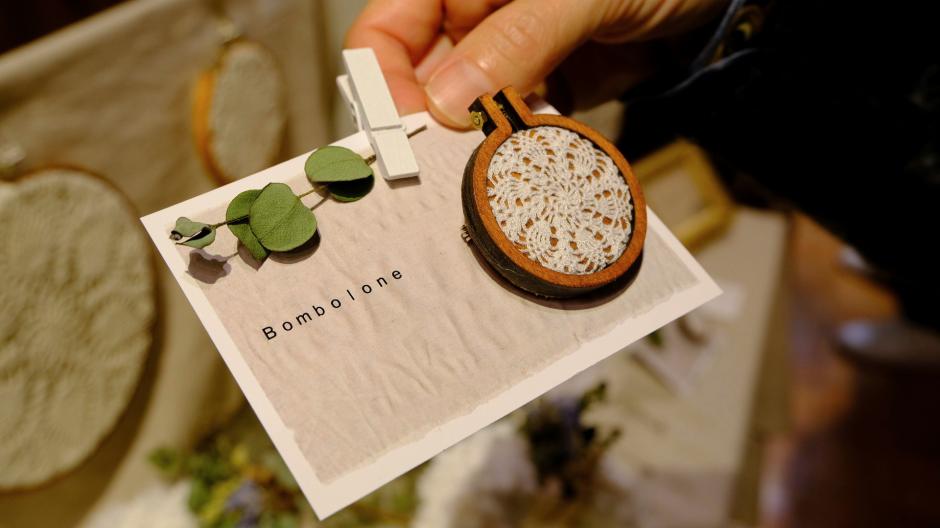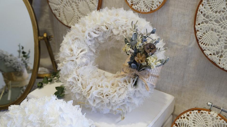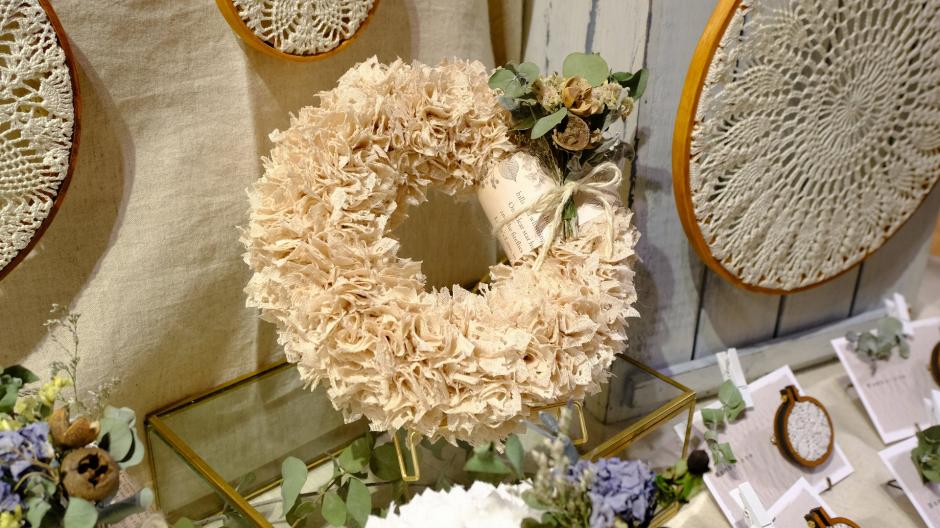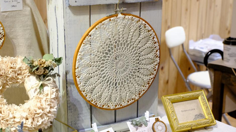 「bombolone」さんのレース編みは大きなものから小さなものまで、緻密に並んだ美しい模様に心惹かれます。もはや肉眼では見えない細い糸も手先の感覚だけで編んでいるそう。レース生地を使った軽くて華やかなリースも可憐です。