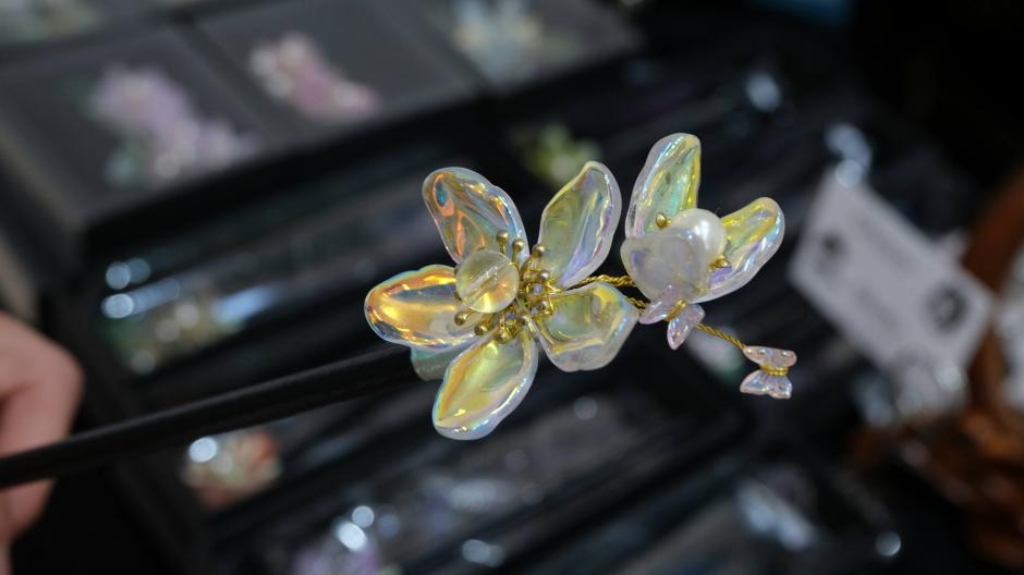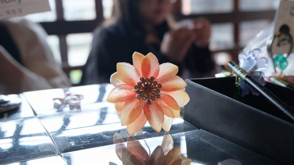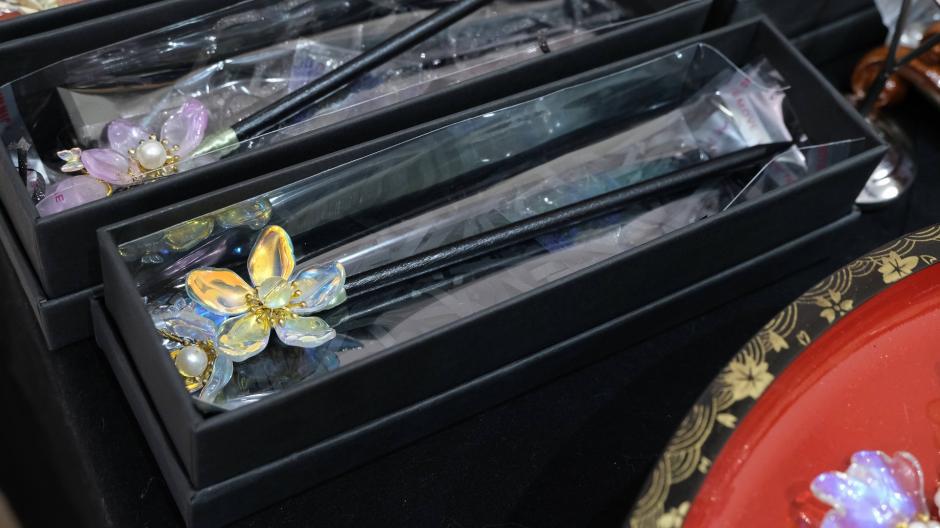 プラバンでできた立体的な金魚が目を惹く「choco&molly」さんのヘアアクセサリーたち。彼女たちの祖国では金魚は金運アップの象徴なんだそう。瑠璃というのも独特な素材です。ガラスビーズのように見えてとても軽い素材。かんざしやヘアコームなど、、華やかに彩るヘアアクセサリーが並びます。