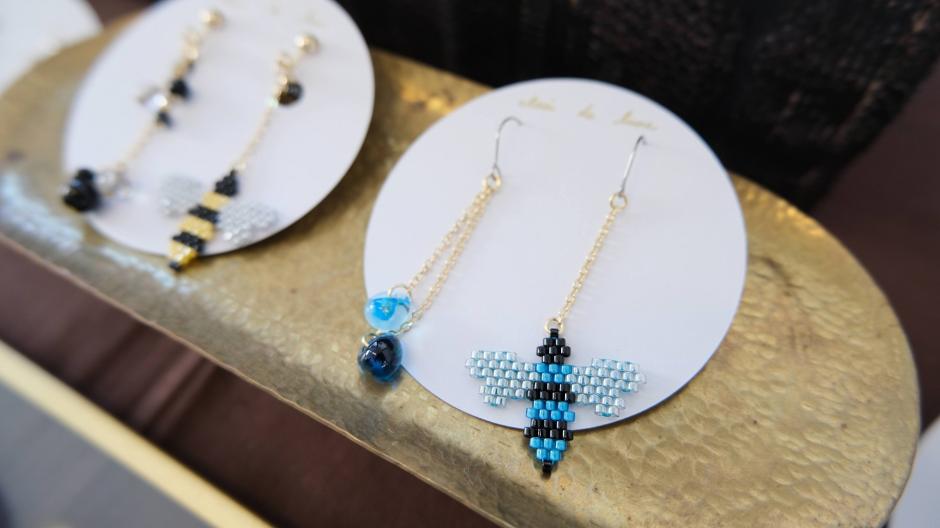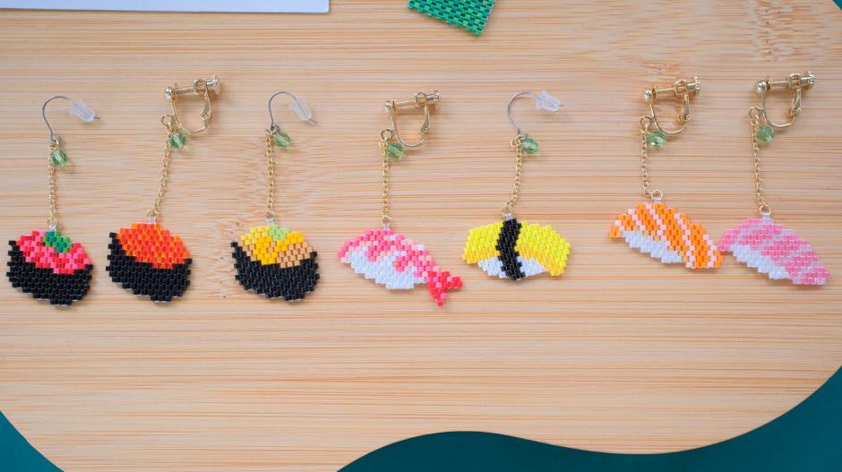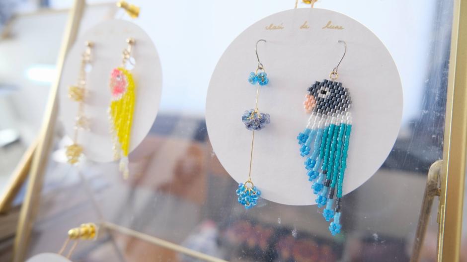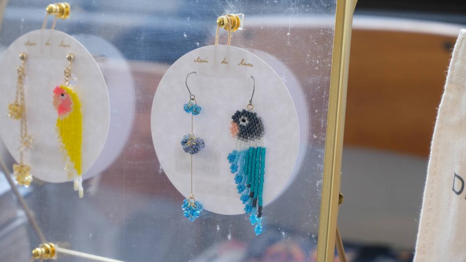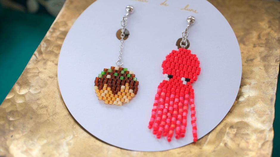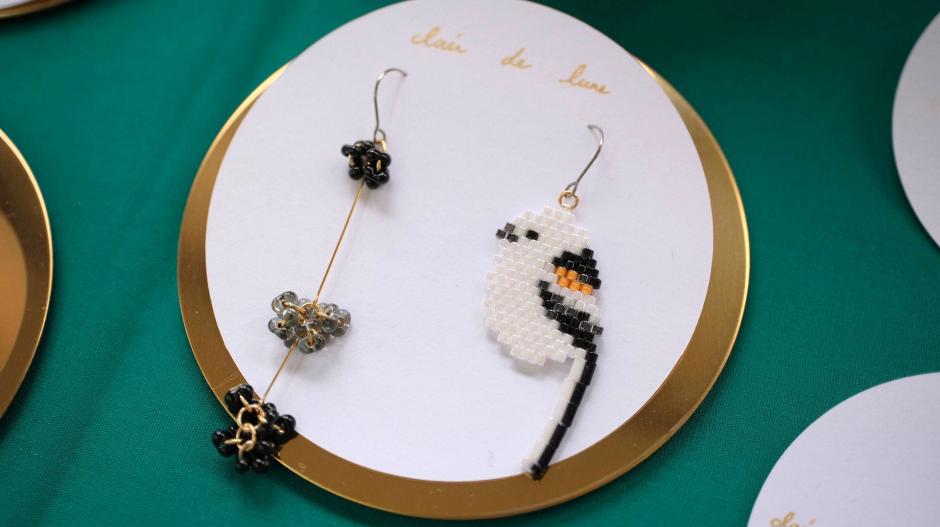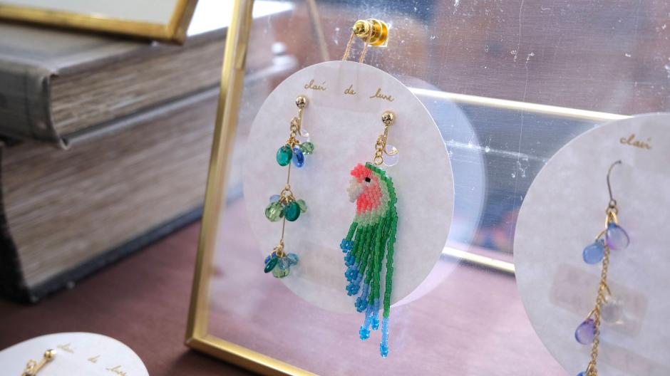 鳥さんシリーズ、ネイティブ柄シリーズ、食べ物シリーズなど、様々なモチーフをビーズ編みで作っちゃった「clair de lune」さん。独自のアイデアで生み出されるビーズステッチの作品にはファンも多いです。シリーズが違ってもテイストは同じなので、左右で違う作品を組み合わせてつけられるのもおしゃれの楽しみが広がっていいですね。