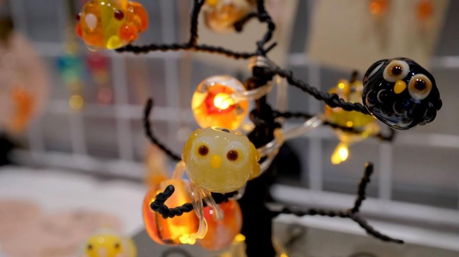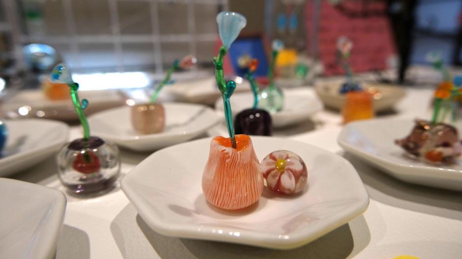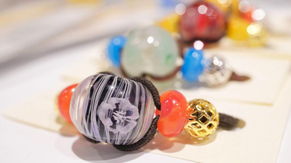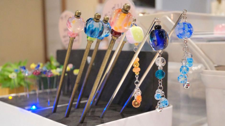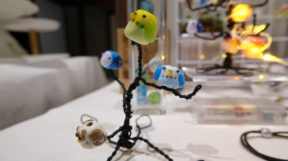 熱い熱いバーナーワークから生まれたとんぼ玉たち。「COKUTO」さんこだわりの鳥さんや、小さなお花など、細部までこだわったとんぼ玉が並びます。アクセサリーとして身につけたり、飾ったり、光を集めてキラキラ輝きますよ。