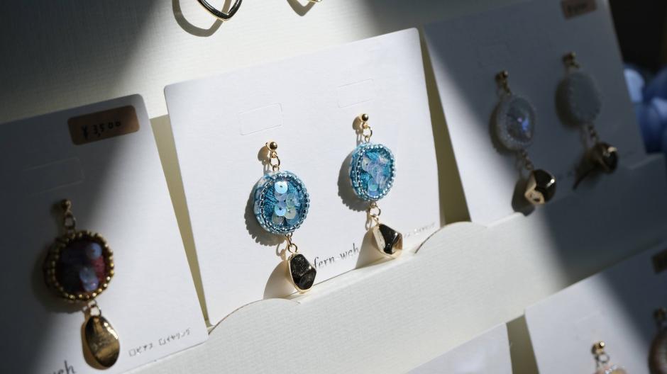 小ぶりのものも大ぶりのものも、きらきらと光り輝いて顔周りを華やがせてくれる「fern-weh」さんのアクセサリーたちです。