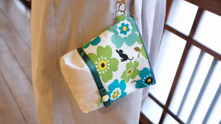 コットンの和柄を使ったスマートケースやポーチ、ミニバッグなどを作られている「花日和」さん。伝統的な柄がお好きなので、鶴モチーフが多めです。アンティーク着物のような華やかさがある作品です。