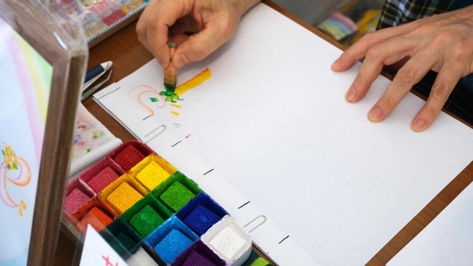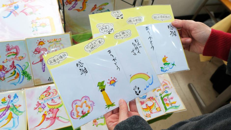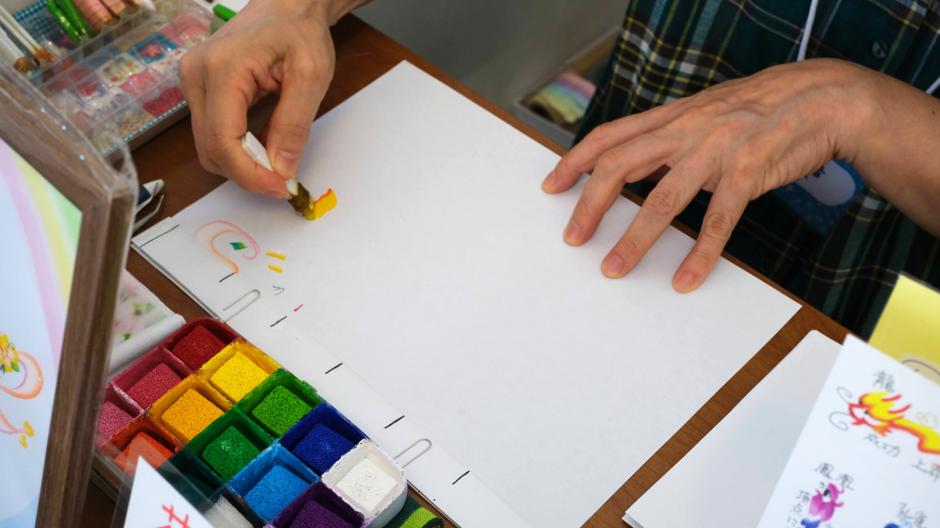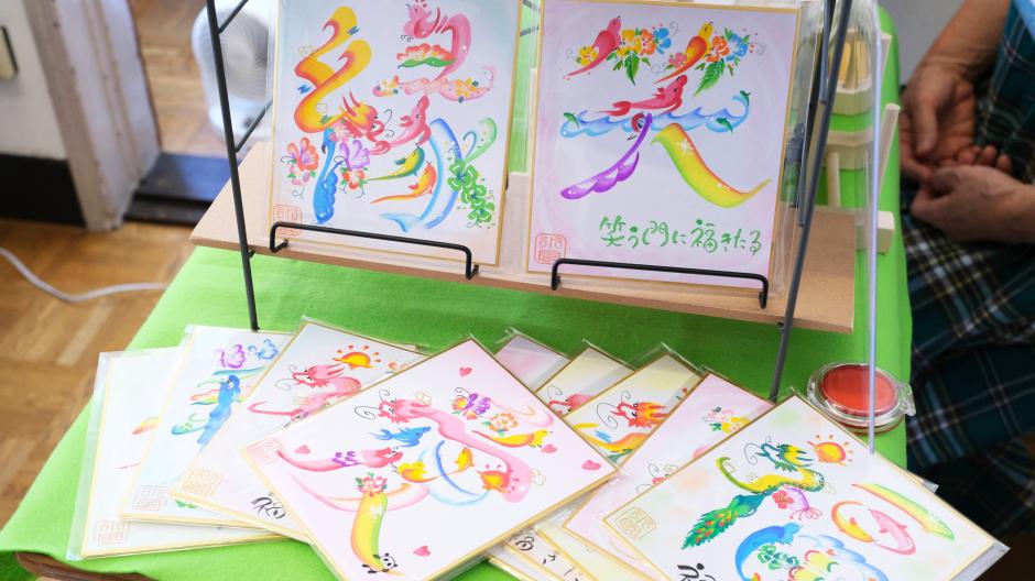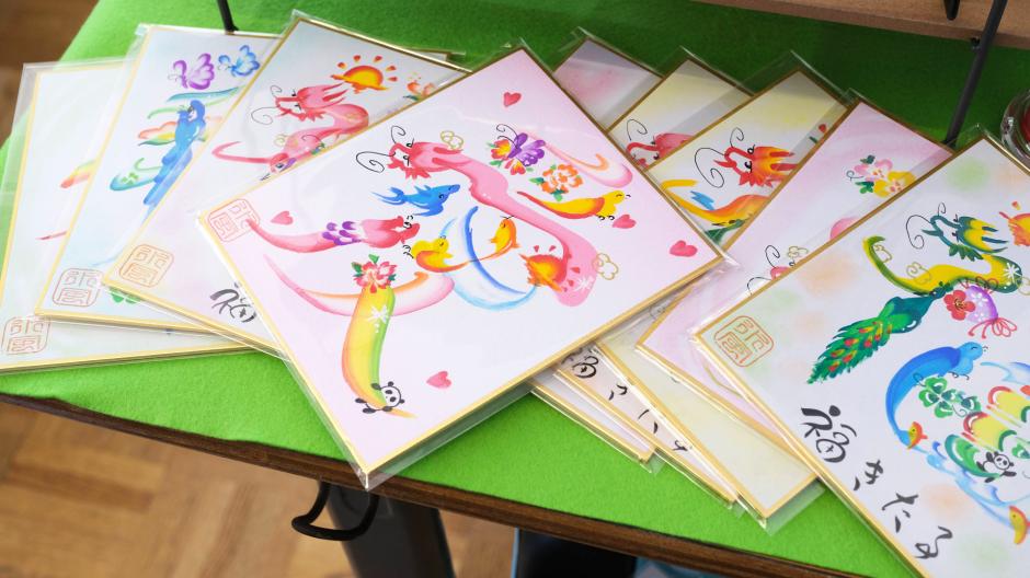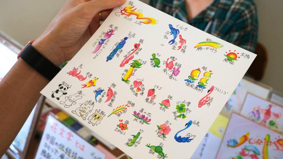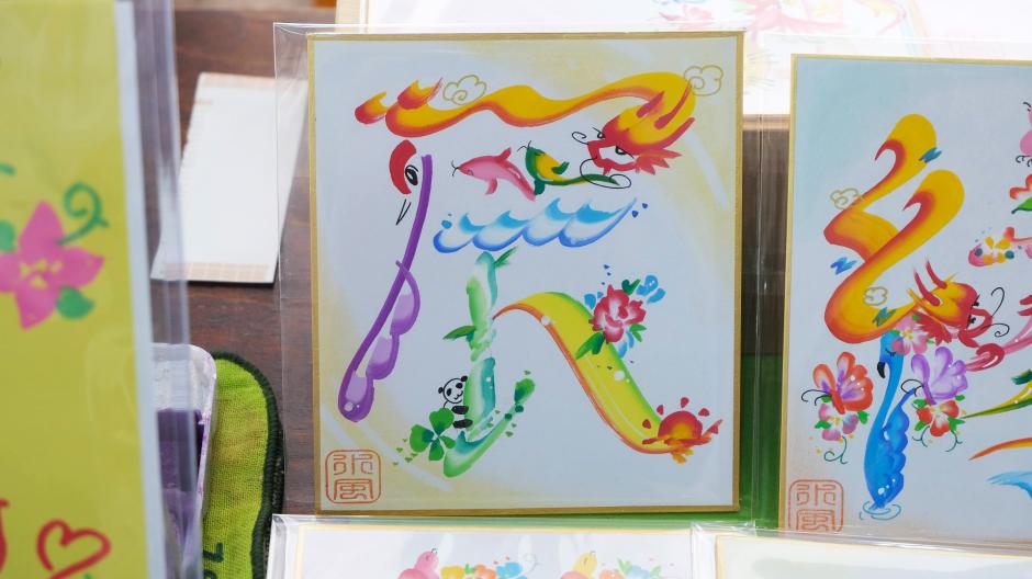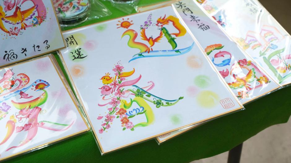 風水的に縁起の良い絵柄を組み合わせて花のような文字を描き出す「花文字ガーデン水風」さん。開運招福を願い、舞い踊るように描かれた花文字は美しく、見ていて元気が出てきます。