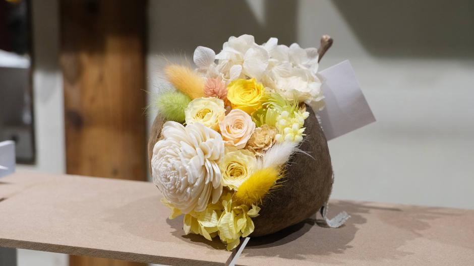 幸せを呼ぶ実♡と言われているブッタナッツにプリザーブドフラワー、ドライフラワー、ソラフラワー、ナッツなどでアレンジをしています。 軽くて丈夫なクラフトテープでバッグやかごを作っています。