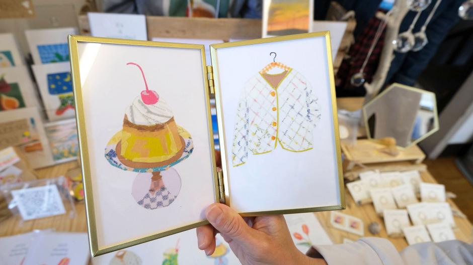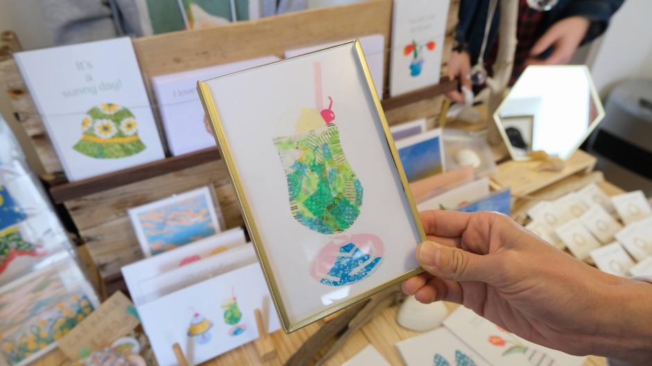 マスキングテープを使った切り絵で素敵なイラストを描かれている「In the Sun store」さん。原画をよーく見ると、使われているマスキングテープの柄が見えて面白いです。オイルパステルで描いたイラストも。イラストはポストカードやシールになっています。