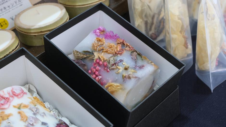 廃棄されようとしたものに新たな価値をつけ足して生み出された「ippoアップサイクル」さんの作品たち。花卉農家の廃棄花や、籃胎漆器の竹の節部分などを使い、キャンドルや針山などにアップサイクル。竹の節部分のアップサイクルの提案をお求めだそうです。