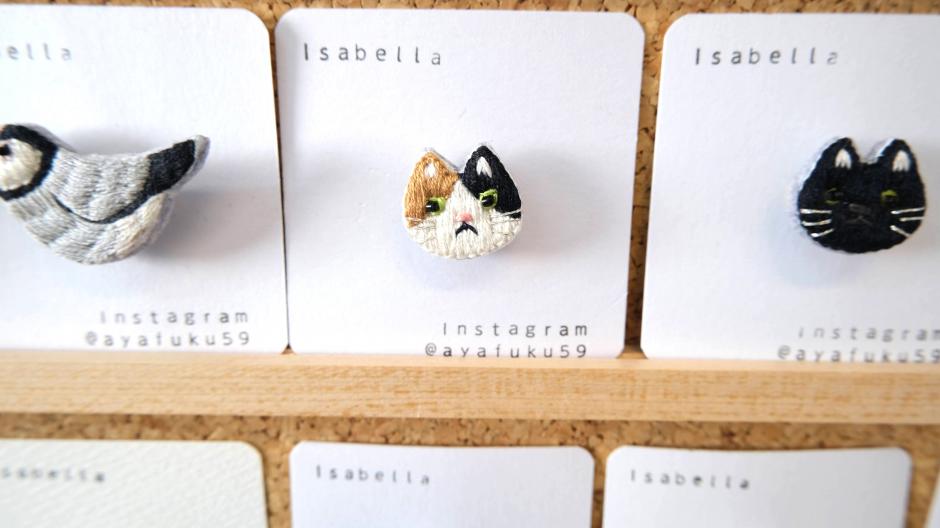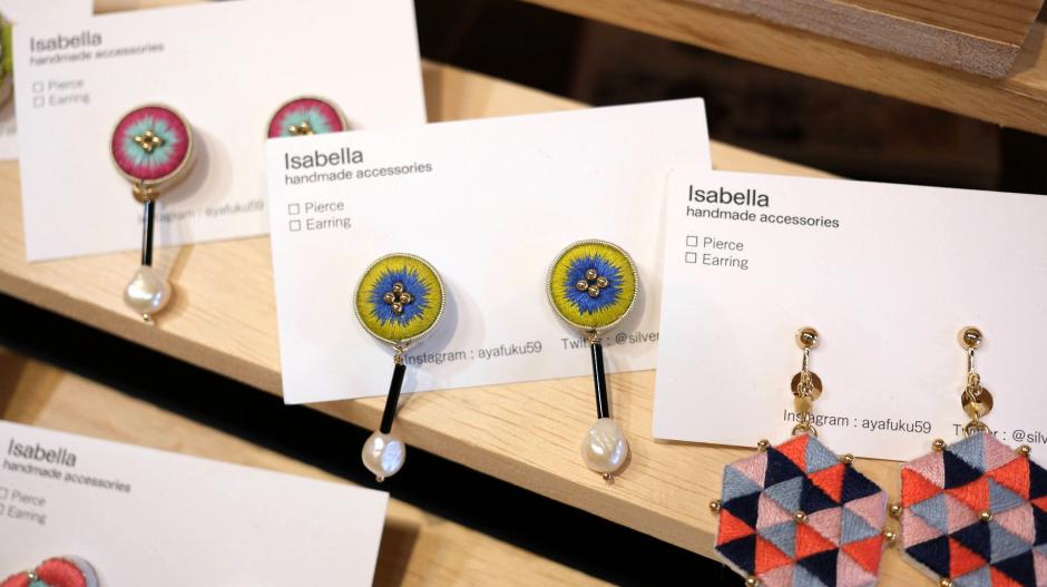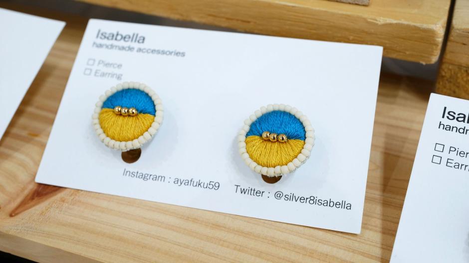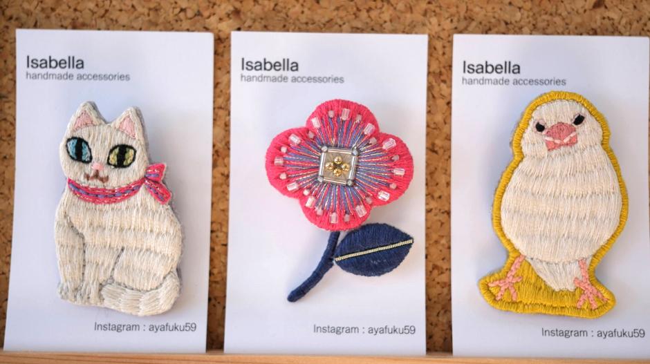 花、動物、幾何学模様、どんなモチーフもかわいく刺繍アクセサリーにしてしまう「isabella」さん。テーマに沿った作品作りもお手の物。過去にはモアイ!なんて変わりダネも。ハコイチ出展中もちくちく縫い縫いされていますので、どんどん出来上がっていく作品を見るのも楽しいです。クレイのシルバーアクセサリーも作られています。