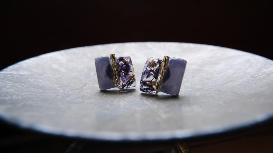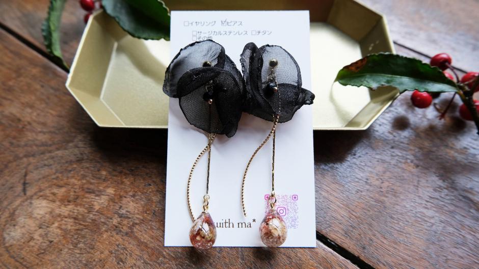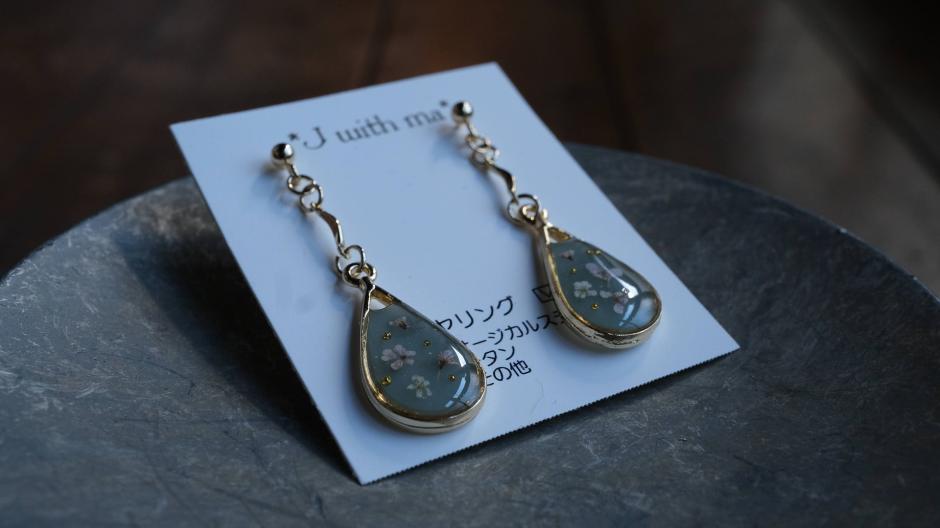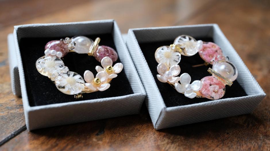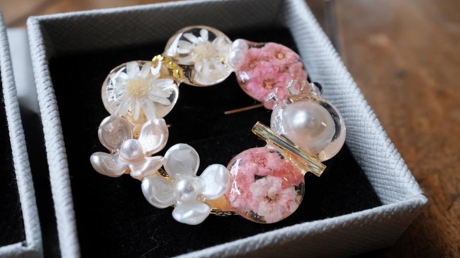 本物のお花を使ったレジンアクセサリーや小物を作っている「*J with ma*」さん。色鮮やかなのは本物のお花だからこそ。印鑑ケースやピルケース、スプレーボトルなどバッグの中に入れておける大人かわいい花雑貨がたくさんあります。