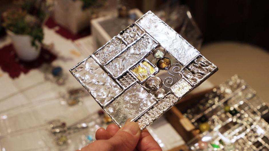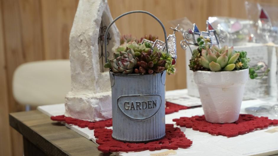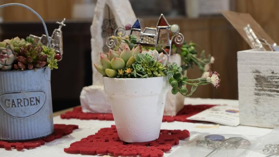 「こねるて」さん特製のガラスを組み合わせたガーデンピックは、庭や室内の植物を光を集めて素敵に彩ってくれます。多肉植物も好きだそうで、多肉の寄せ植えをするための鉢も作られています。