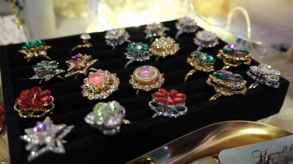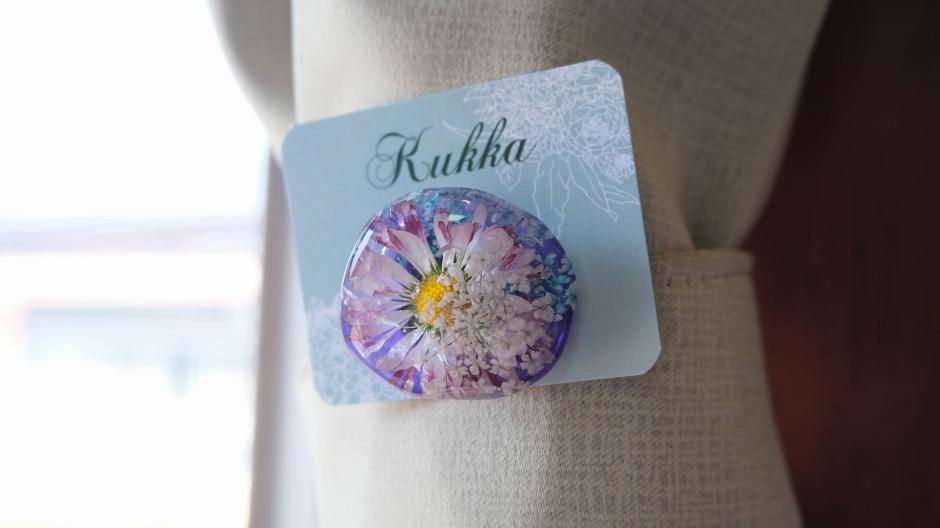 自分で育てたお花をドライにして閉じ込めている「kukka」さんのレジンアクセサリー。だからこそ咲いている姿そのままのような美しさがあります。他にも染めてつくりましたというフラワーパーツを使ったヘアアクセや、回転する指輪など、ならではの魅力がたっぷりです。