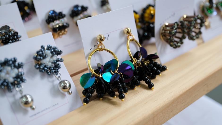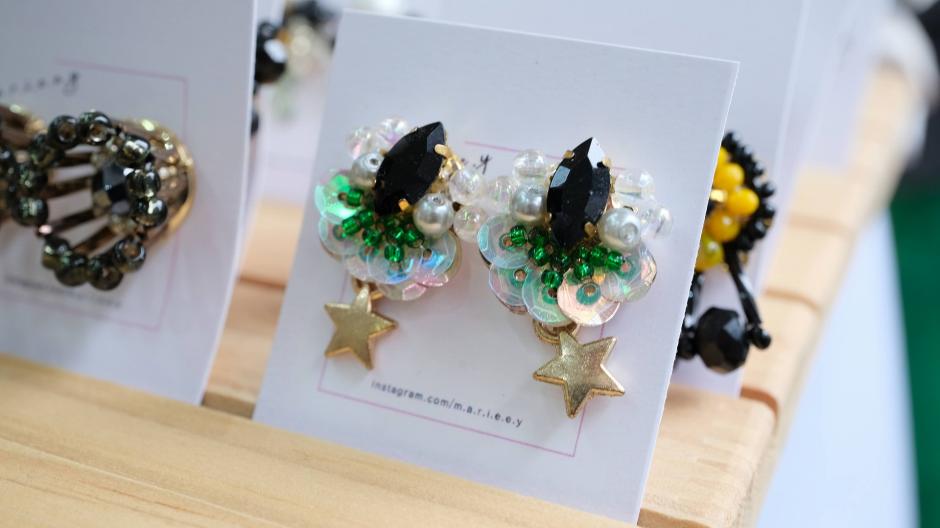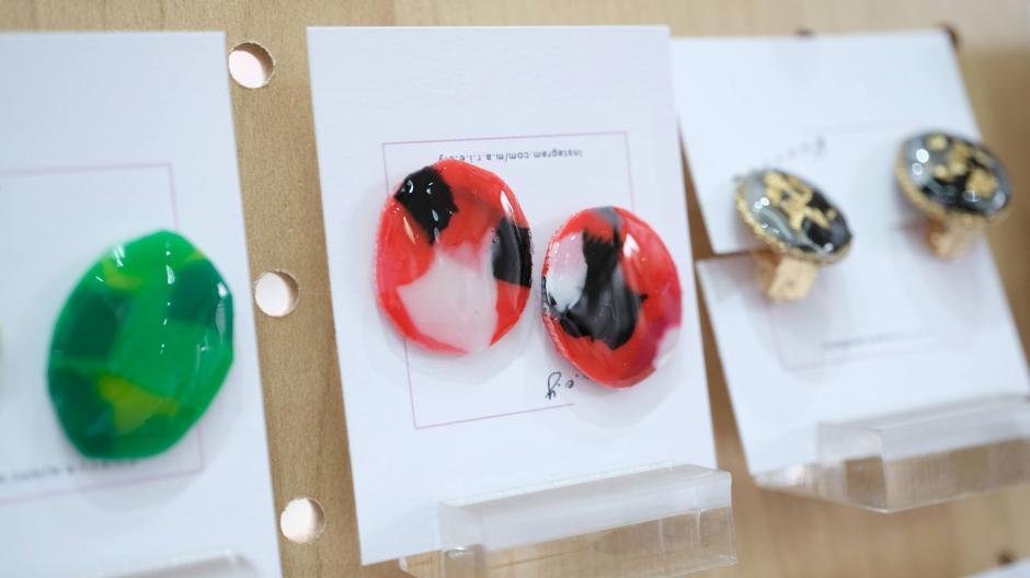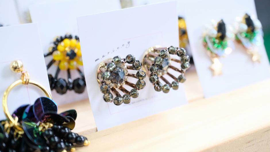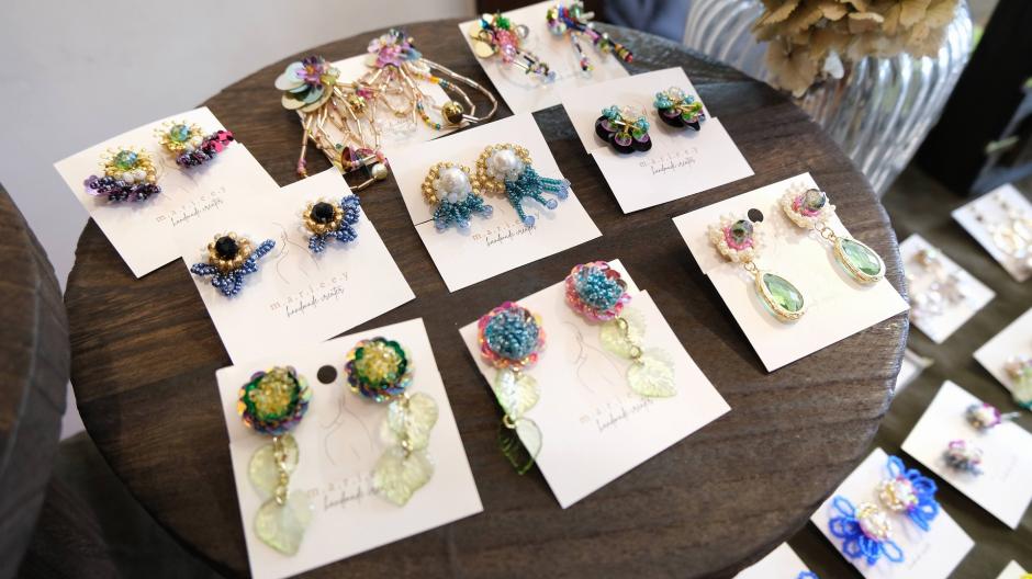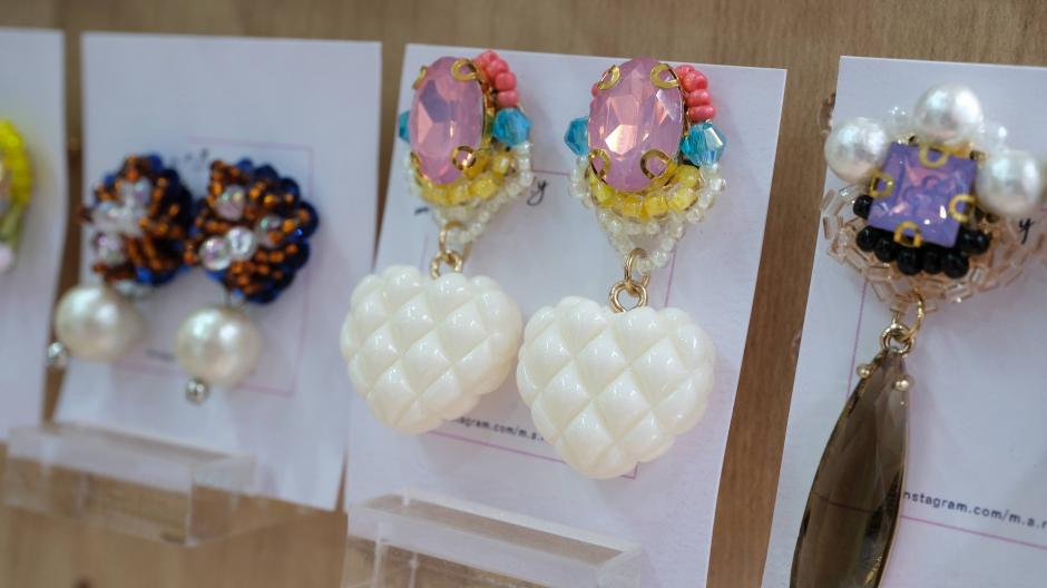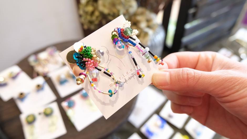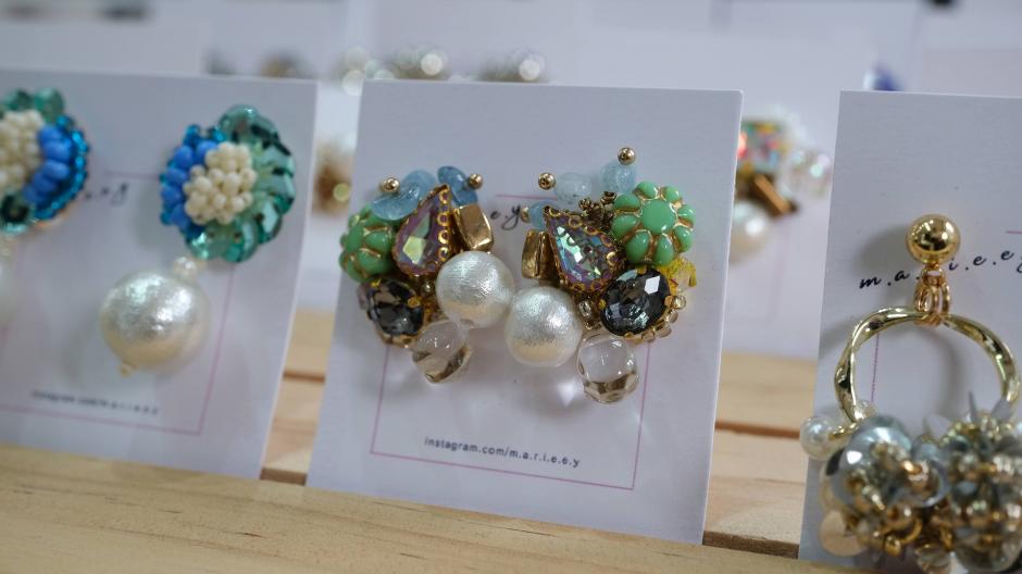 パワフルでカラフルなアクセサリーを作られている「m.a.r.i.e.e.y」さん。身に着けた瞬間からパッと華やぐアクセサリーです。