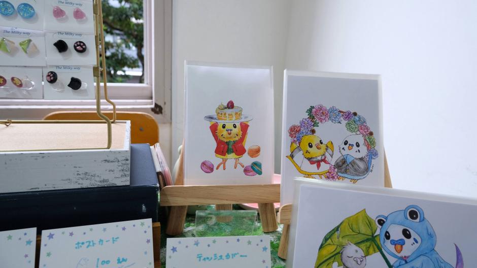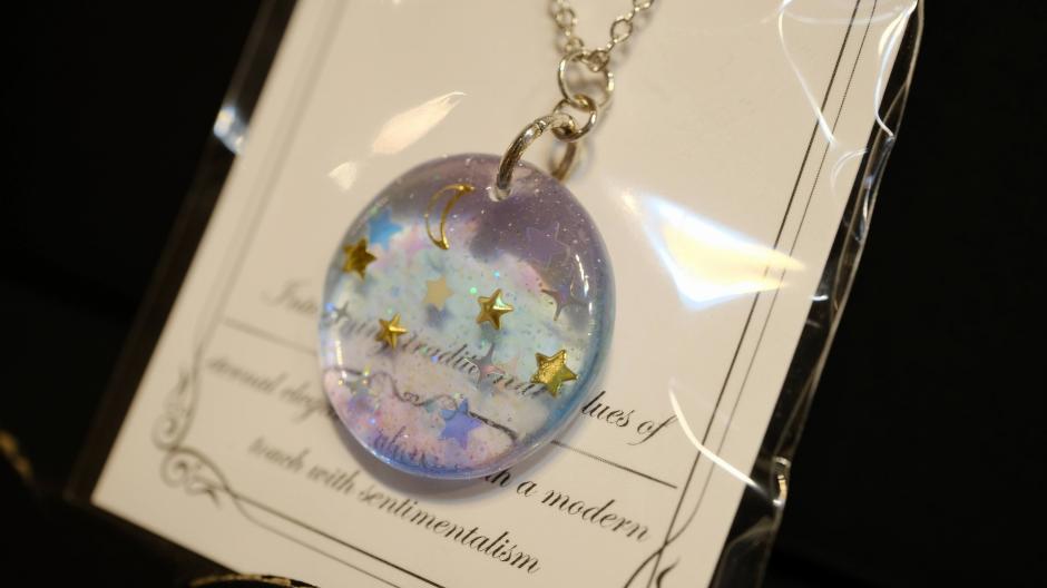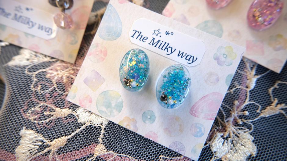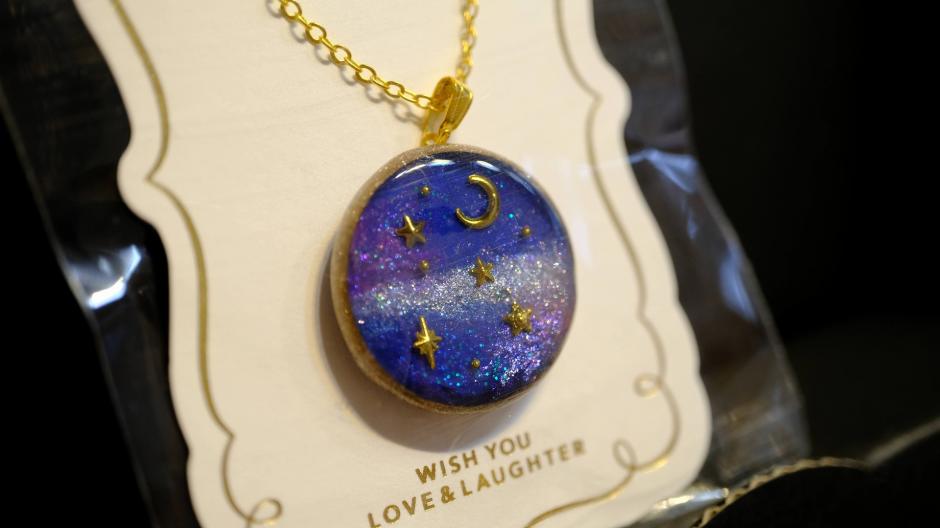星空や動物モチーフのレジンアクセサリーやポストカードなど