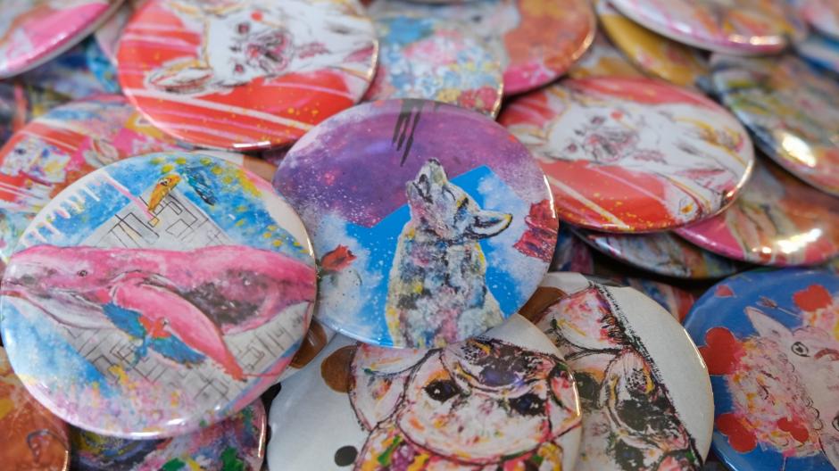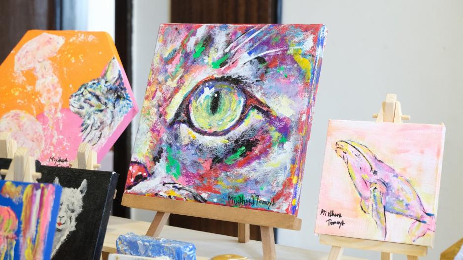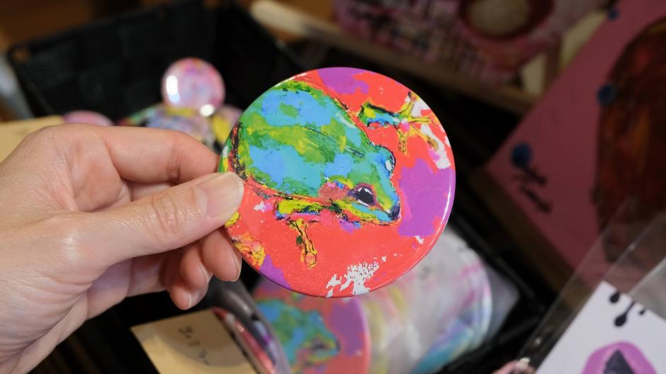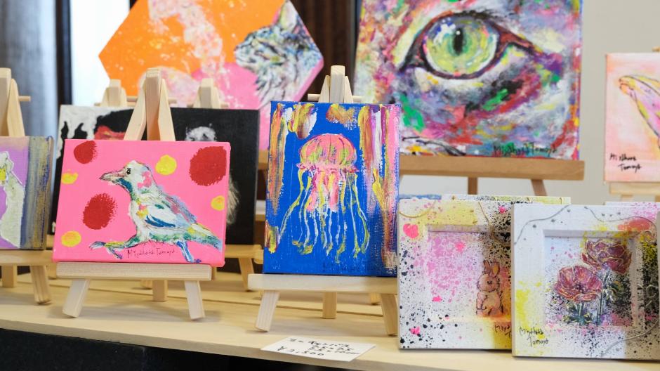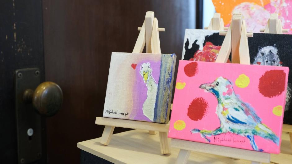 絵はアナログオンリーだという「ミヤハラ トモヤ」さん。デジタルでは描けない、3次元の立体アートが目を惹きます。額縁も絵の一部で、躍動感あふれるダチョウやクジラなど動物の絵がメインです。鏡に描かれた絵や、色鮮やかに彩られたトカゲのアクセサリーもあり、描くことが楽しいんだなと伝わってくる素敵な絵描きさんです。