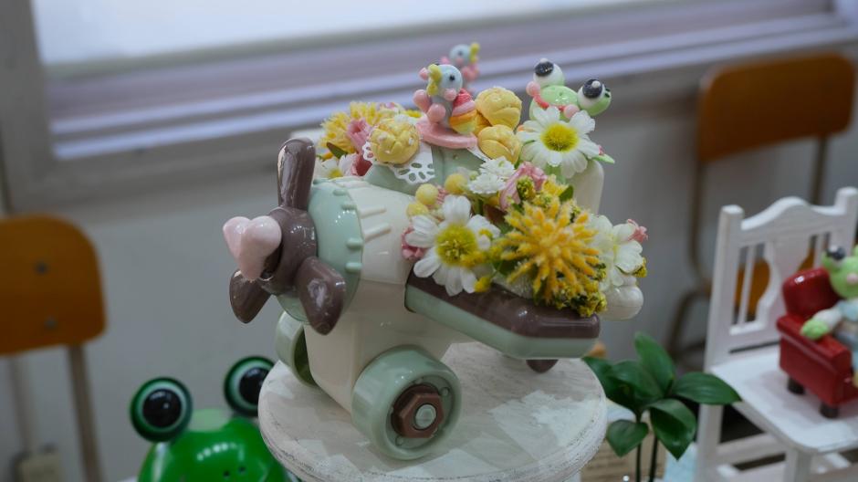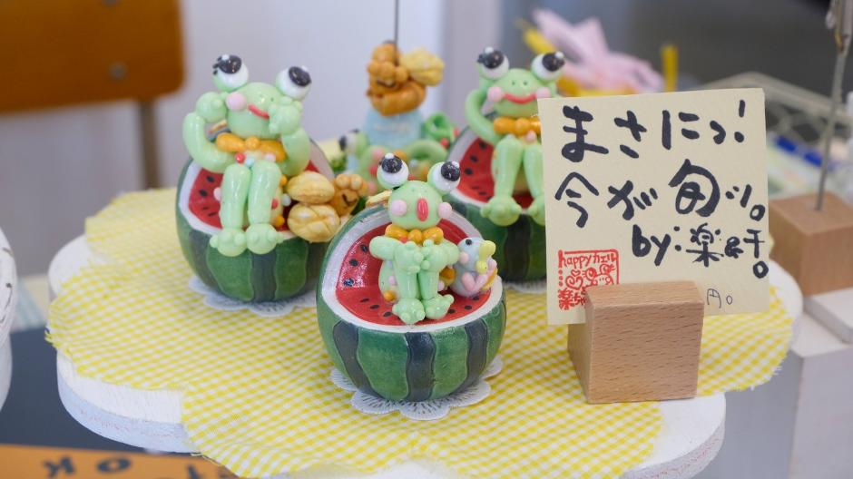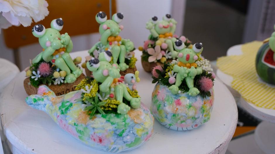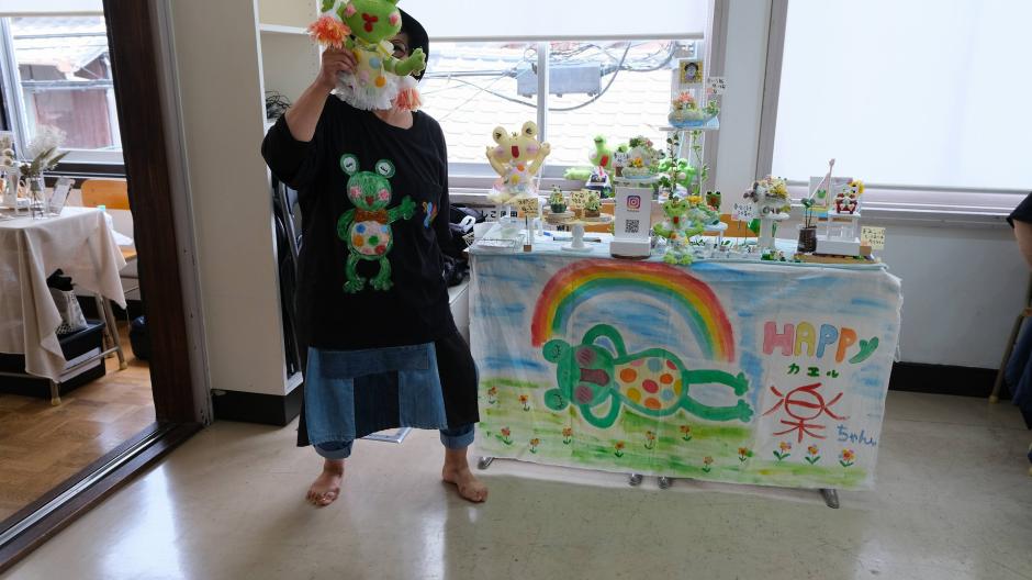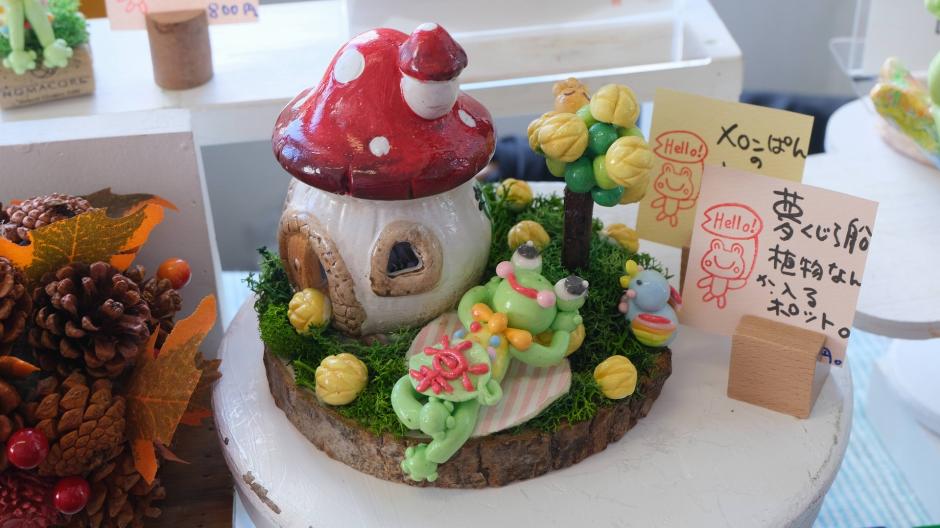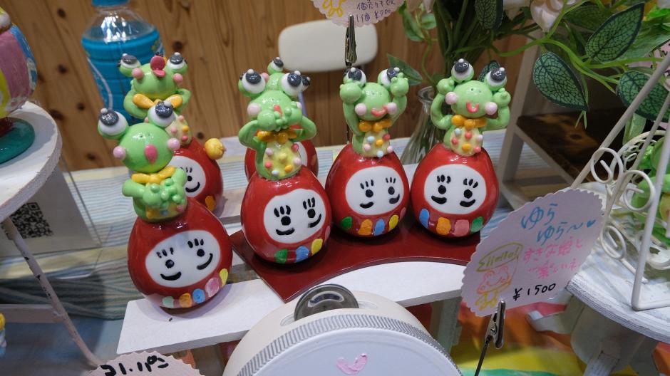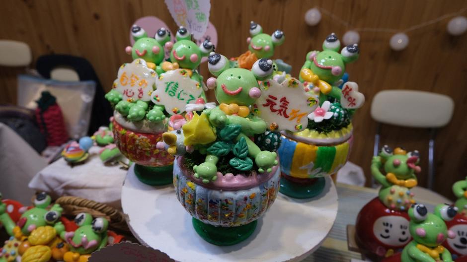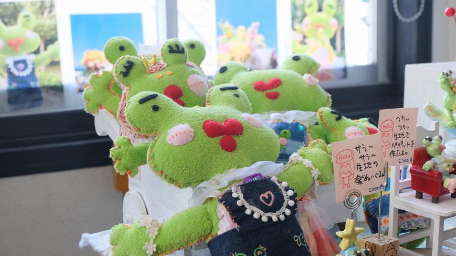 布地や、樹脂粘土でhappyカエル楽ちゃんや小物達