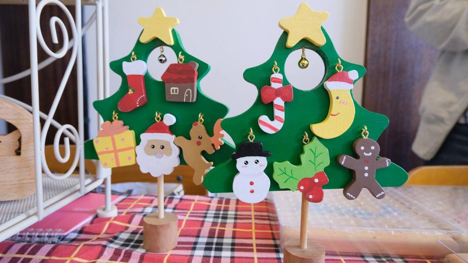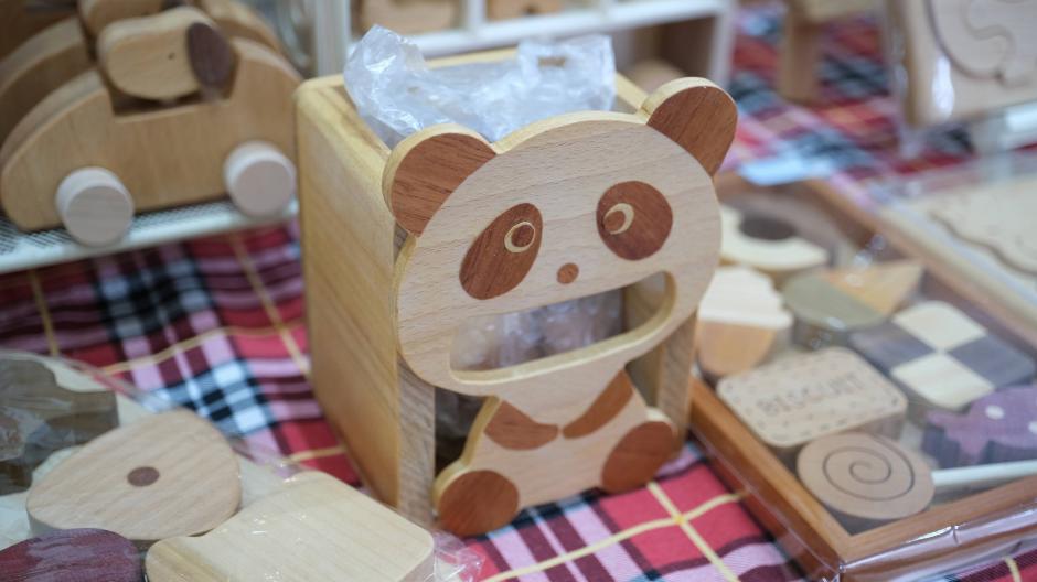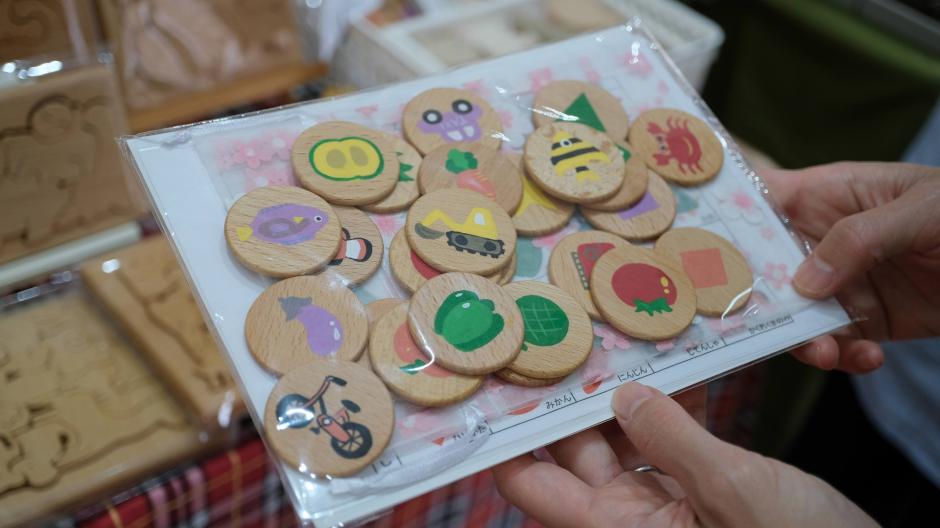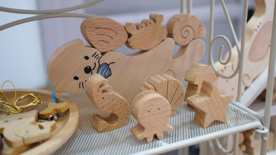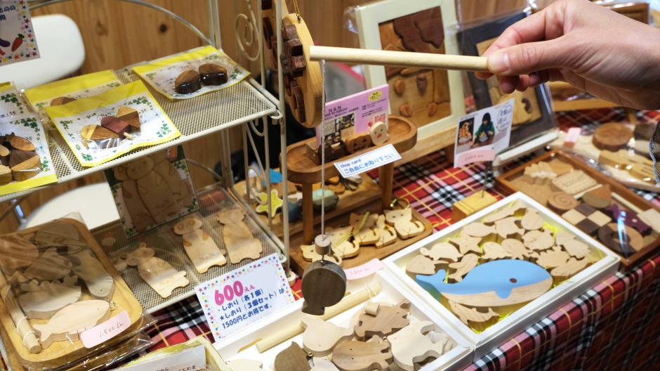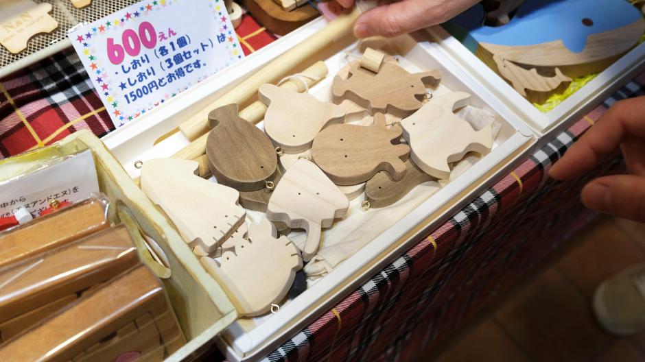 お庭の工房で週末に作品作りをされているという「N&N」さん。木工との出会いはワークショップだったそうですが、自分で作ってみよう、と思い立っちゃうのがさすがです。組み木のパズルや、組み木の釣りゲームなど。木、そのものの色を活かした優しい手触りの木工作品が並びます。