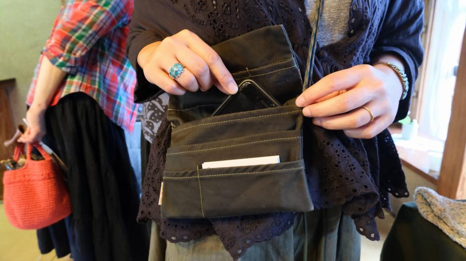 otonが服を作り、その服のハギレをokanが新しい作品へと生まれ変わらせます。「okanSclap」さんはokanならではの視点で、便利で使い心地の良いポーチや、ふわふわの帽子を編まれています。