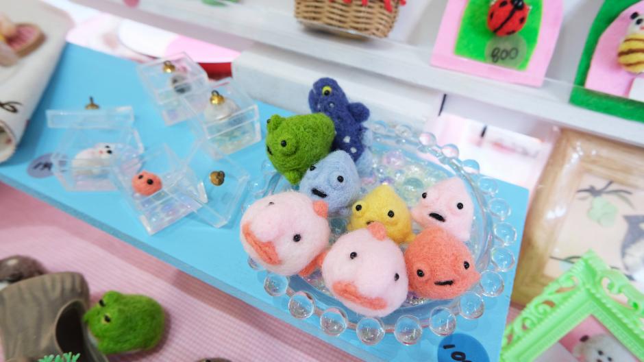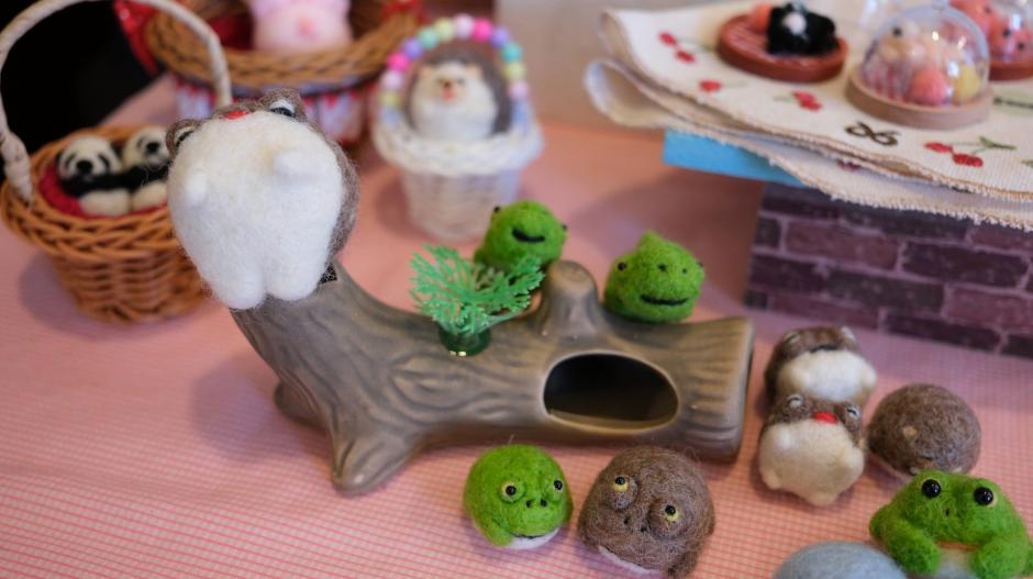 「パンチャック」さんのブースには、羊毛フェルトのかわいい動物たちがわらわらわら…。ぶたにカエルにオランウータン、はたまたかっぱやカメなど。アイデアと遊び心たっぷりの羊毛フェルトアニマルに出会えます。