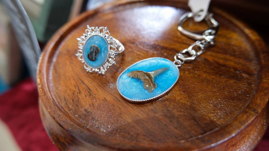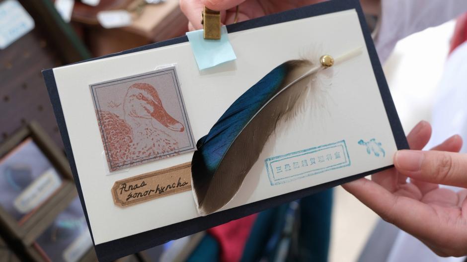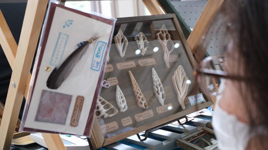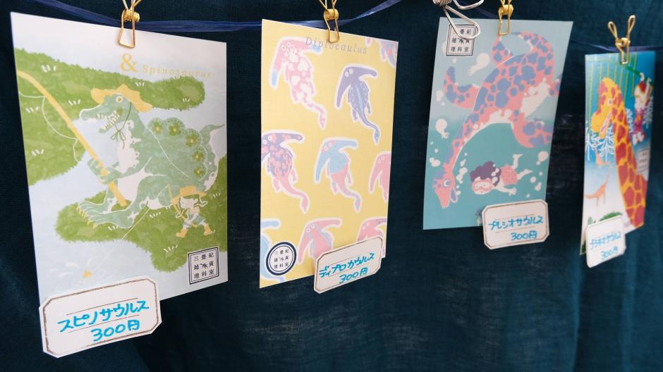 白衣を着た室長が迎えてくれる「三畳紀雑貨理科室」。羽や貝殻、化石、理科心をわくわくさせてくれる面白楽しい標本的作品や、イラスト雑貨が並びます。