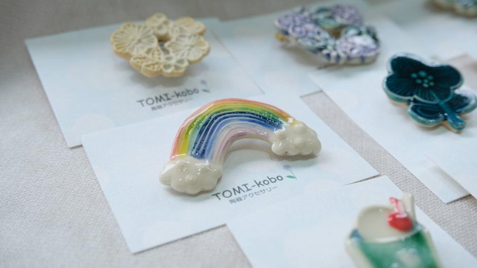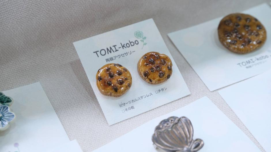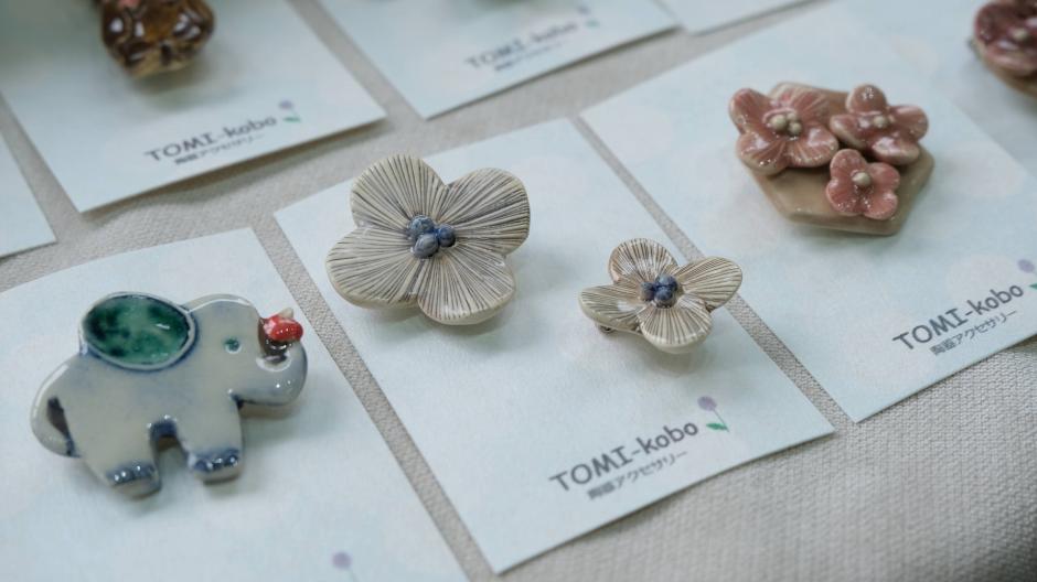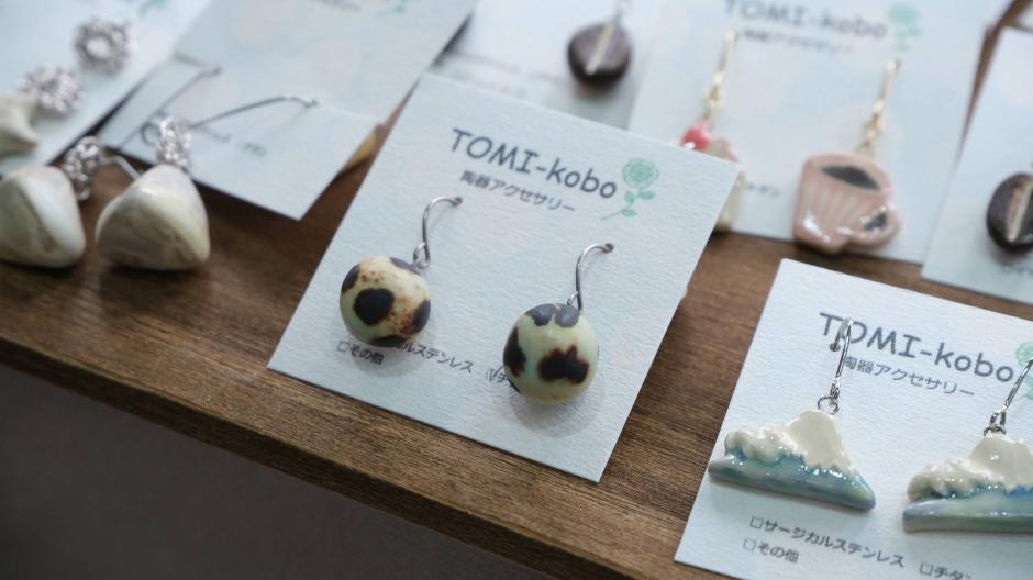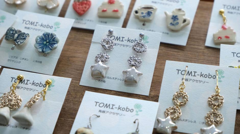 花や果物、動物などのかわいいモチーフをカラフルに焼き上げて「TOMI-kobo」さんのつやつやきらめく陶器のアクセサリーが出来上がりました。イヤリングやブローチの他、箸置きや置物なども。陶器ならではの質感がすてきです。