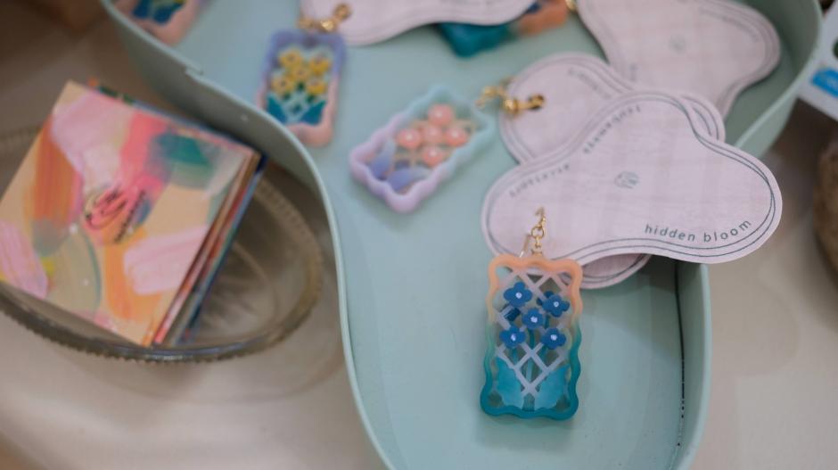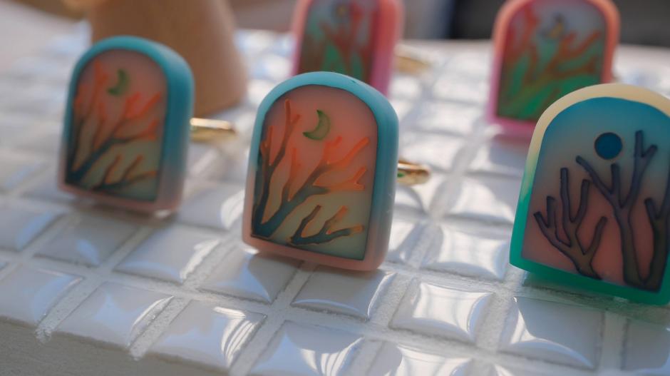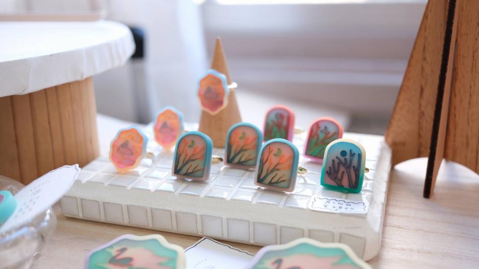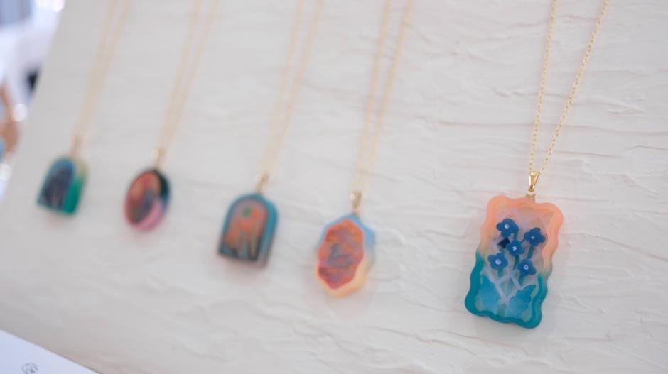 「つばめ屋」さんの第一印象は”透明感”。作品にはいろいろな色が使われているのに、とても透明感があるんです。日々の生活の中で見かける風景が、つばめ屋さんの手によってさまざまな作品になります。例えば「pool」シリーズは夏のプール、「moon phases」シリーズは月の満ち欠け、「波打ち際」シリーズは様々な時間の波打ち際の風景を切り取っています。