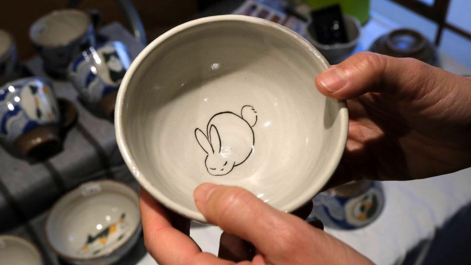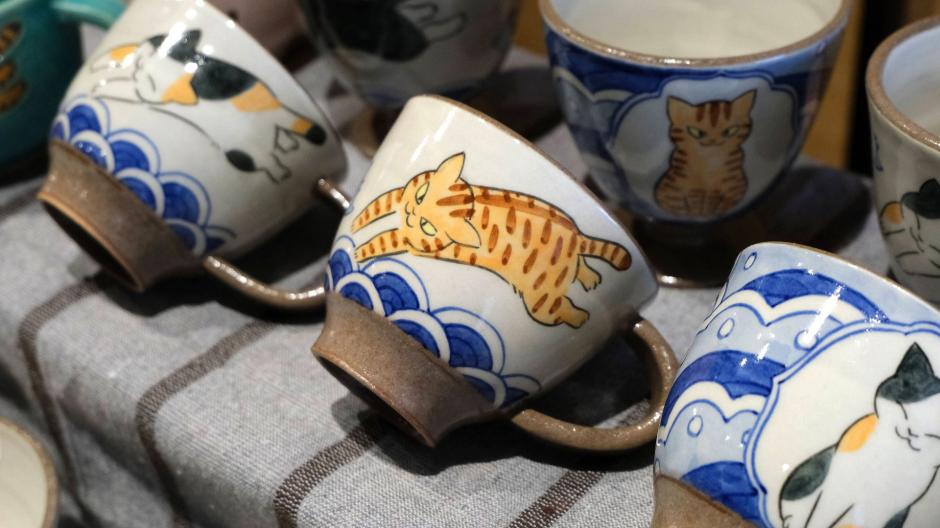 メインキャラクターは愉快な猫ズ。お茶碗にカップにお皿、それぞれに表情豊かに描き出された猫がとてもかわいい「うみねこ工房 久峰窯」さんの作品たち。しっとりと手になじむ、丁寧な手仕事を感じるいい形の器です。
