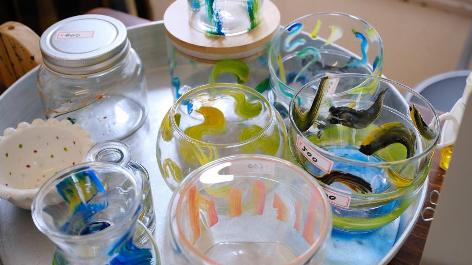 遊ぶように絵を描きます。涼しげな小物も用意しておりますのでぜひお立ち寄りください!