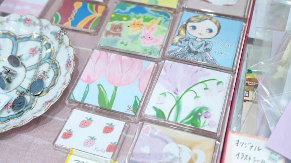 優しい色合いで描かれたオリジナルのイラストを使ったグッズを作られている「イラストYUKO」さん。イラストを使ったポストカードなどの紙ものの他、小物入れなどのグッズもたくさん。ときめきや、わくわく感を大切に作品作りをされています。
